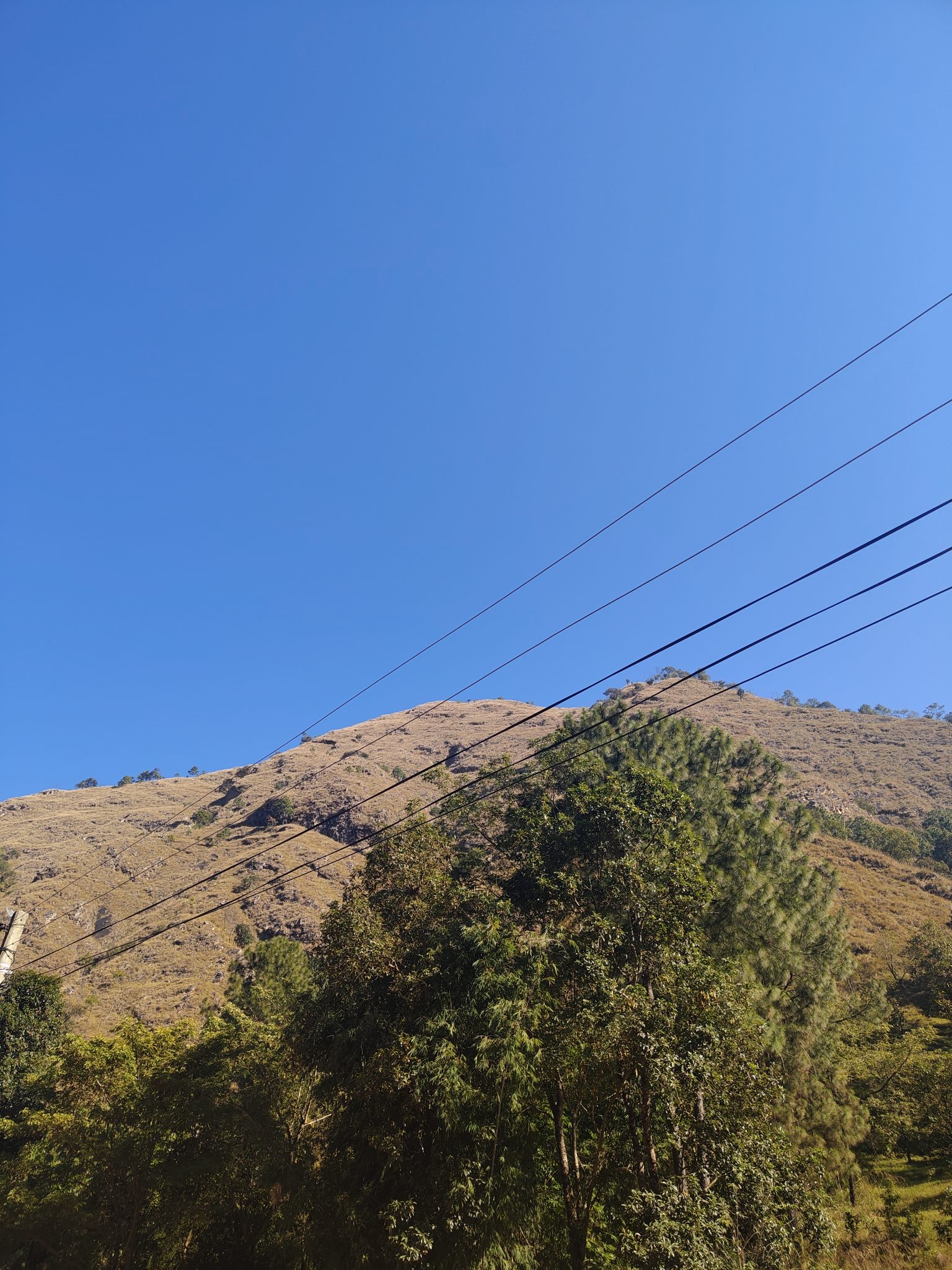 Alternative Text: A clear blue sky over a gently sloping mountain covered with dry grass and patches of trees.