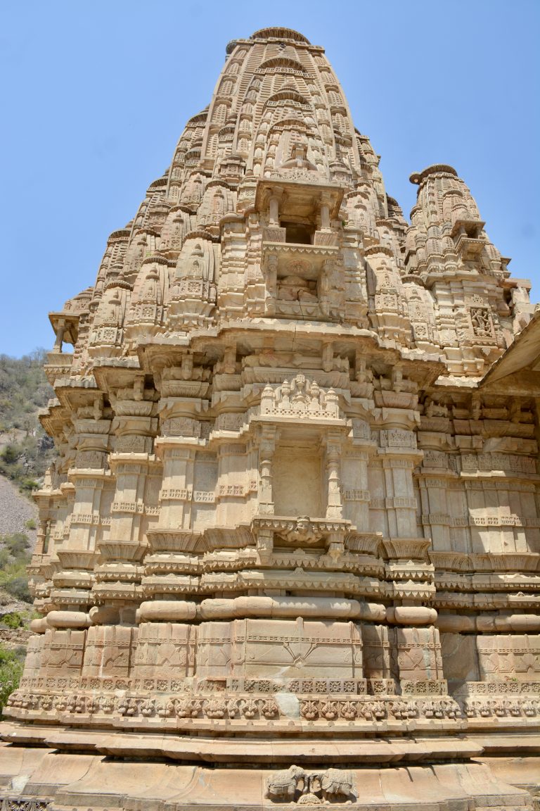 Alternative Text: An intricately carved stone temple tower in Bhangarh Fort, Alwar, Rajasthan, displays stunning ancient architecture against a clear blue sky.