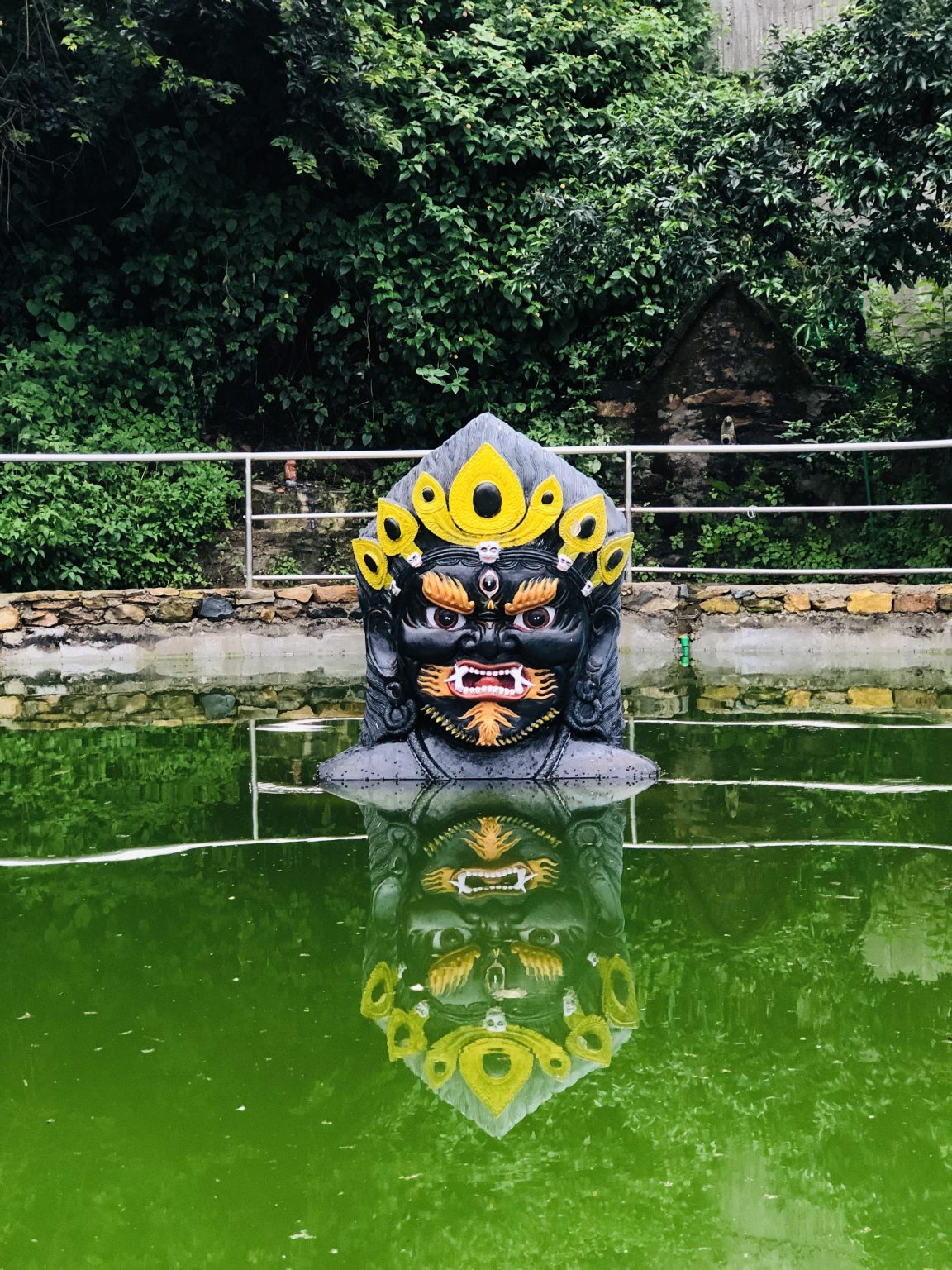 Alternative Text: God Bhairava Head statue inside the pond at Kritipur Nepal