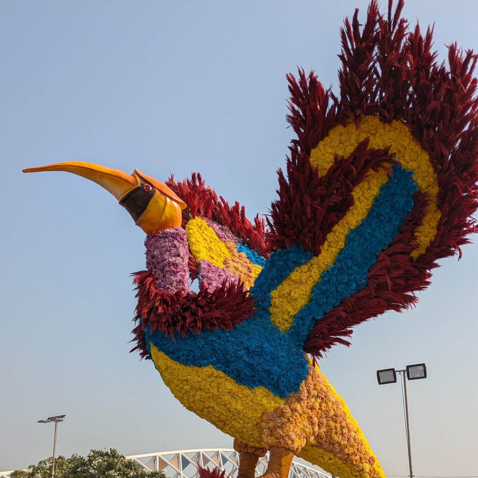 Alternative Text: A vibrant floral sculpture of a large bird made with colorful flowers and foliage, featuring shades of red, yellow, blue, and purple, displayed in a garden setting with a clear sky and a bridge in the background.
