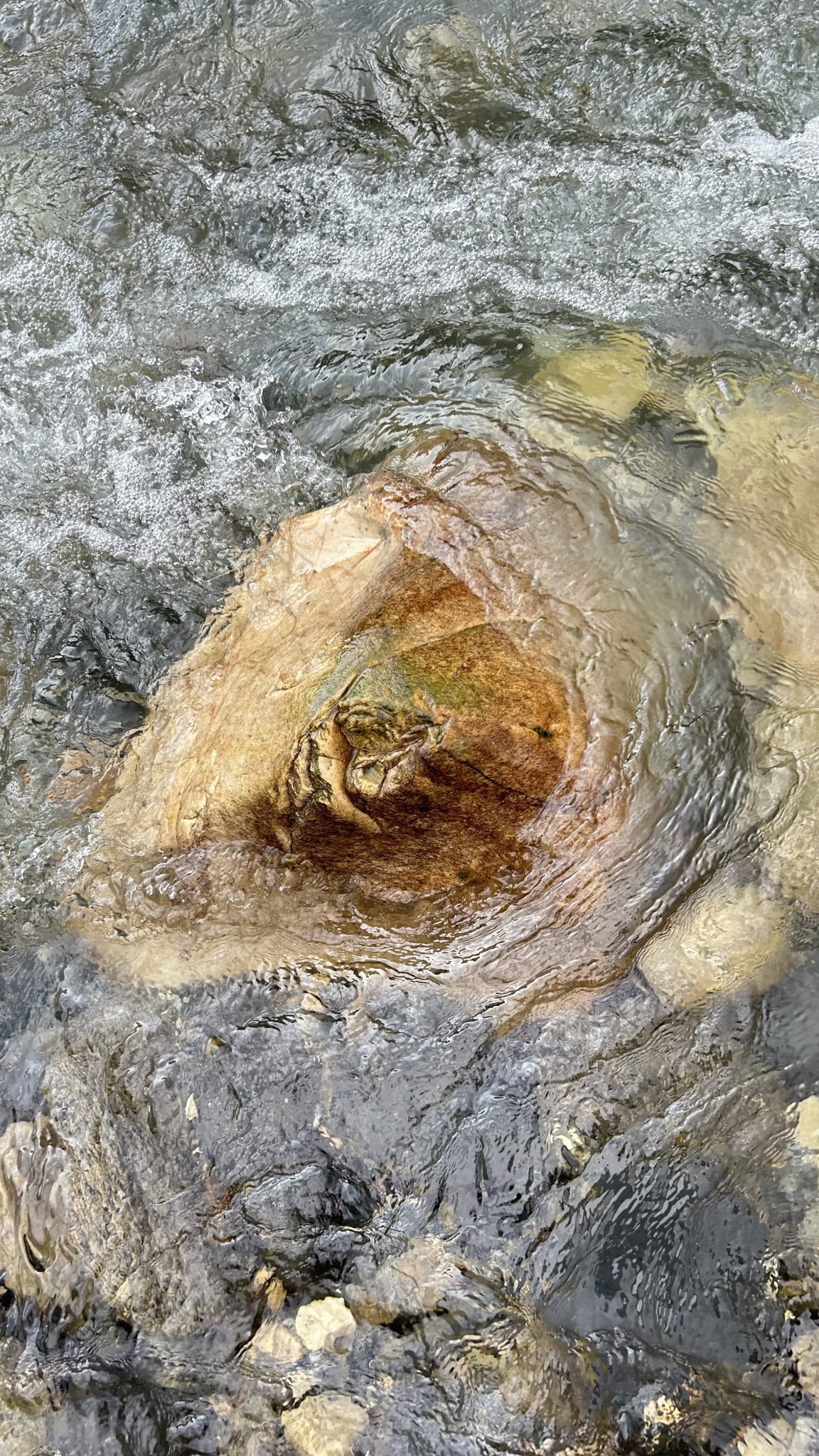 Alternative Text: A close-up view of a stream with gently flowing water. In the center, a large rock is partially submerged, revealing a smooth, rounded surface that has a marbled texture with shades of brown and green.
