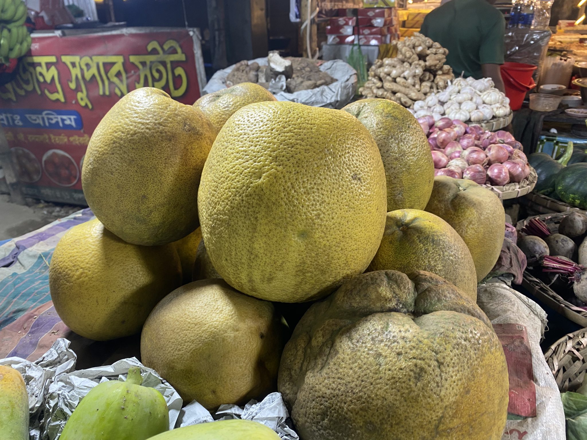 Alternative Text: A pile of large yellow pomelos is prominently displayed at a vibrant market stall. In the background, various vegetables like garlic and onions are neatly arranged.