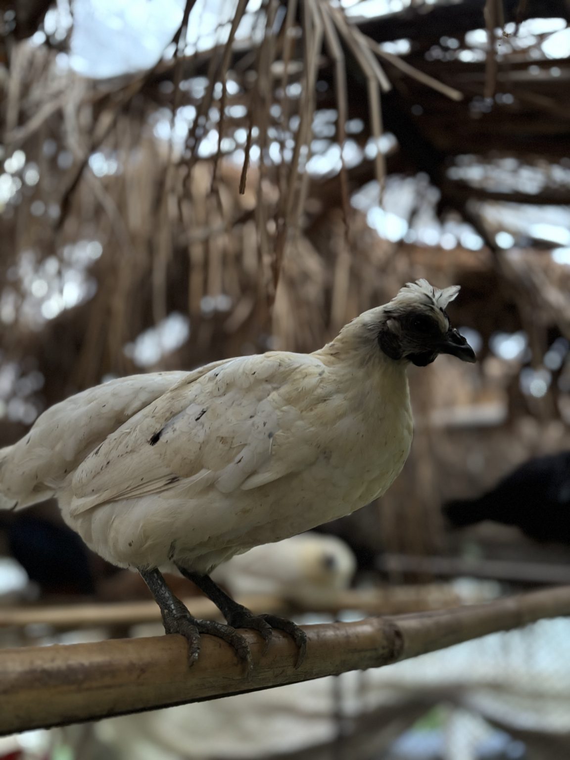 Alternative Text: A white-feathered Chicken perched on a bamboo branch, with a distinctive crest on its head and dark markings around its face.