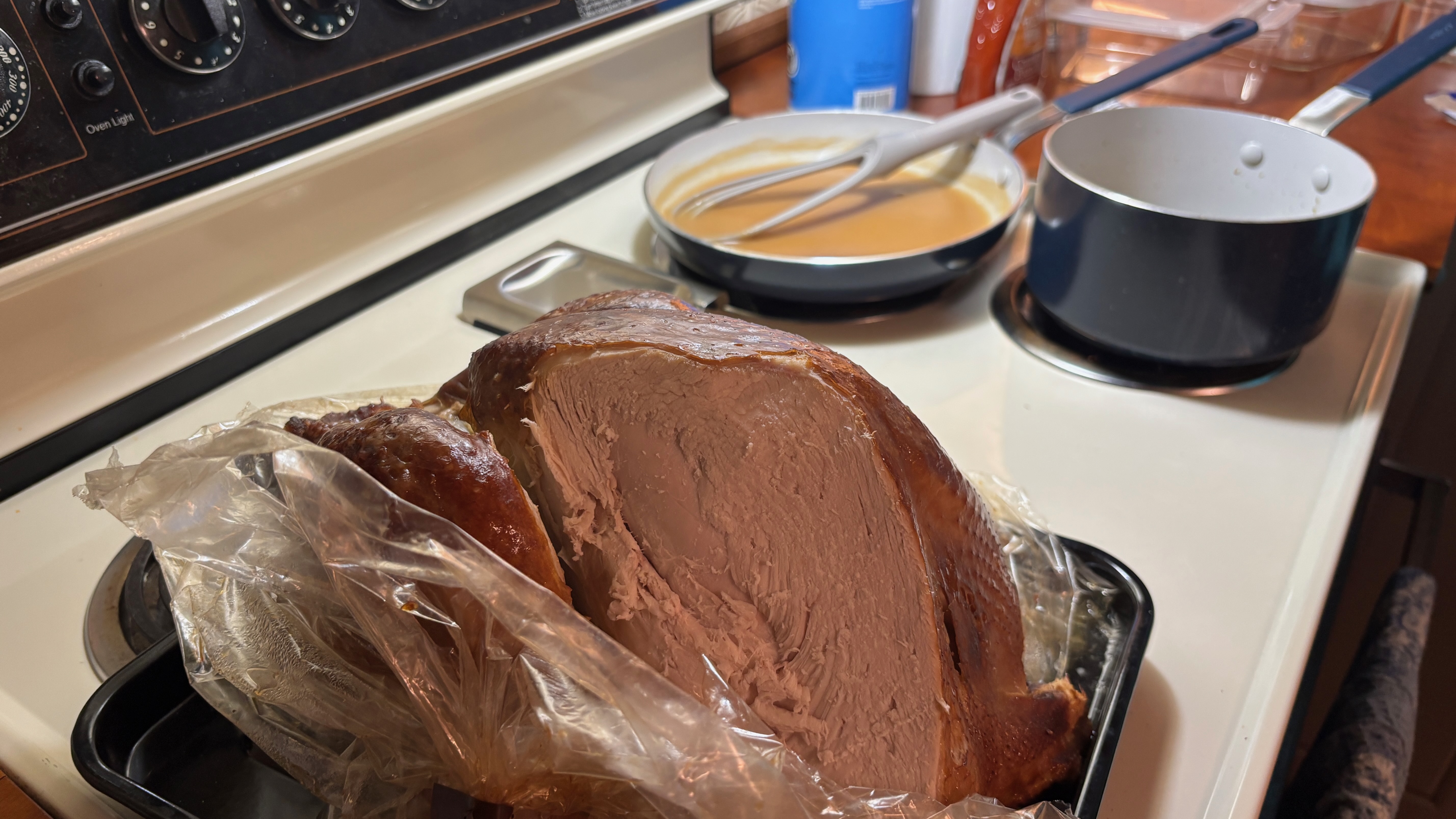 Alternative Text: A meal on the stovetop. In the foreground, a turkey in a plastic bag on a metal plate with a slide taken from the breast. In the background a flat pan with gravy in it, and a saucepan.