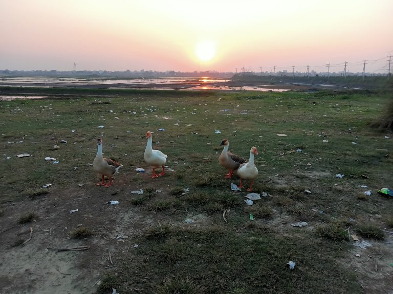 Alternative Text: Four geese on a grassy field at sunset in Kawtoli, Brahmanbaria, Bangladesh.