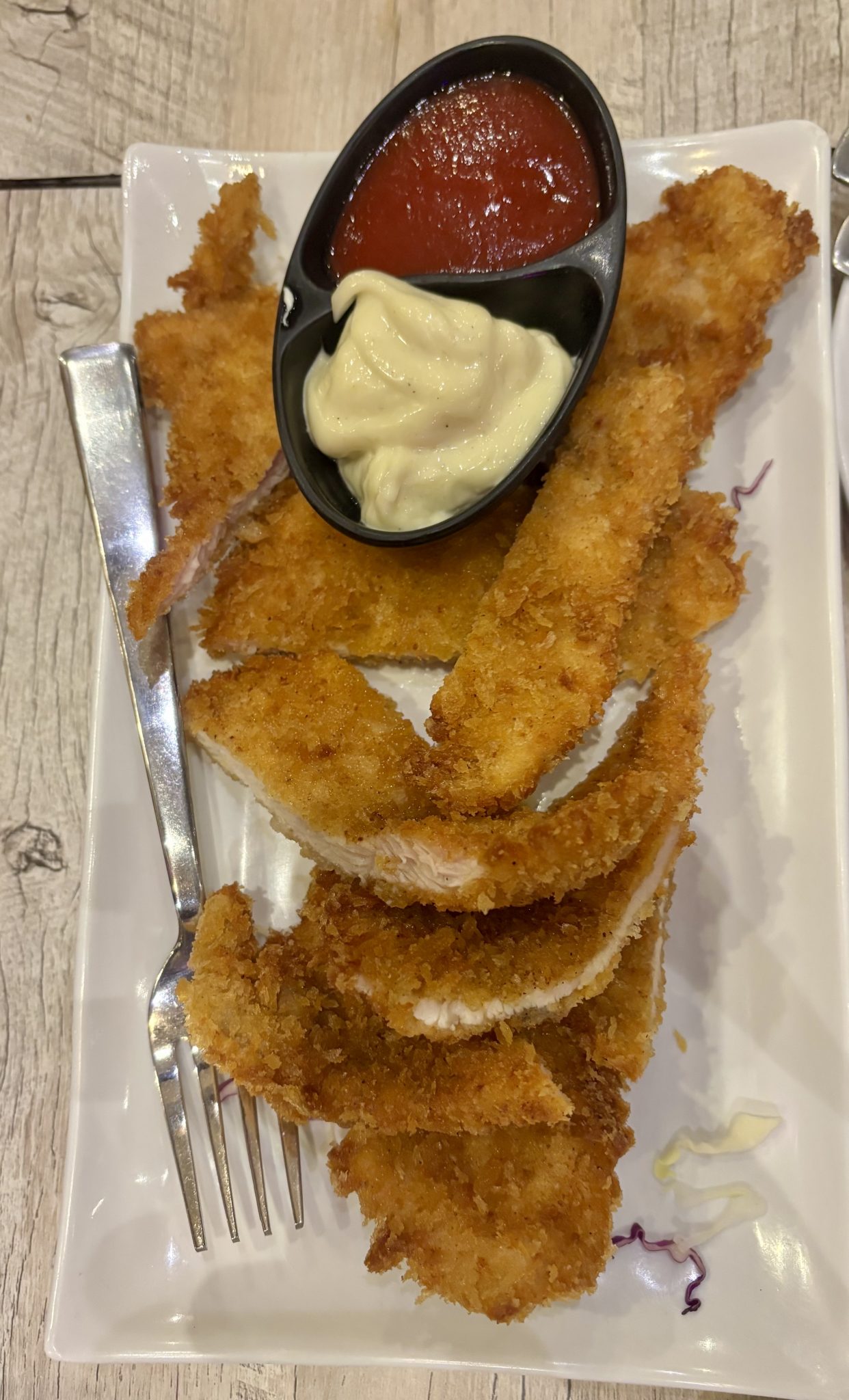 Alternative Text: A plate of golden-brown breaded chicken strips arranged neatly, accompanied by a small black dish containing ketchup and mayonnaise.