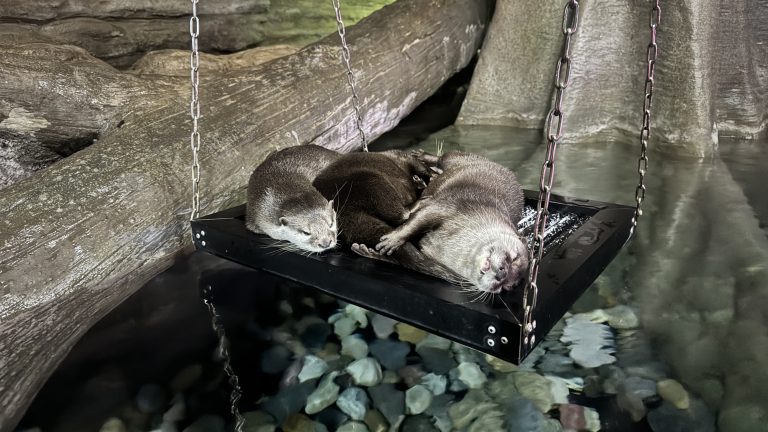 Alternative Text: A cozy scene featuring three otters resting together on a suspended platform above water.