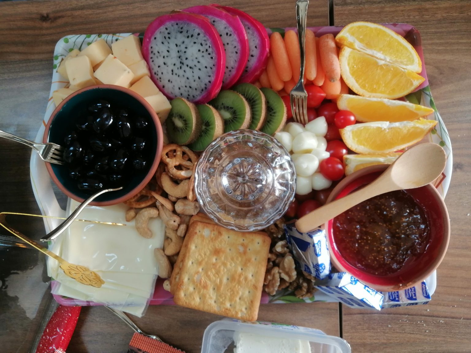 Alternative Text: A colorful platter featuring a variety of snacks and fruits. It includes cubes of cheese, slices of dragon fruit, kiwis, carrots, cherry tomatoes, and orange segments. There are also black olives in a small bowl, mixed nuts and pretzels, cream cheese, and crackers.