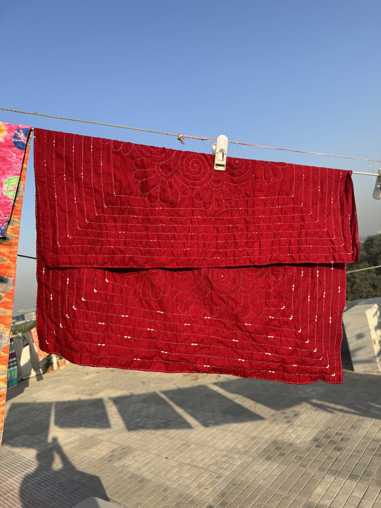 Alternative Text: A deep red, hand-stitched quilt with an intricate white thread pattern is pinned to a clothesline, drying in the sun on a rooftop