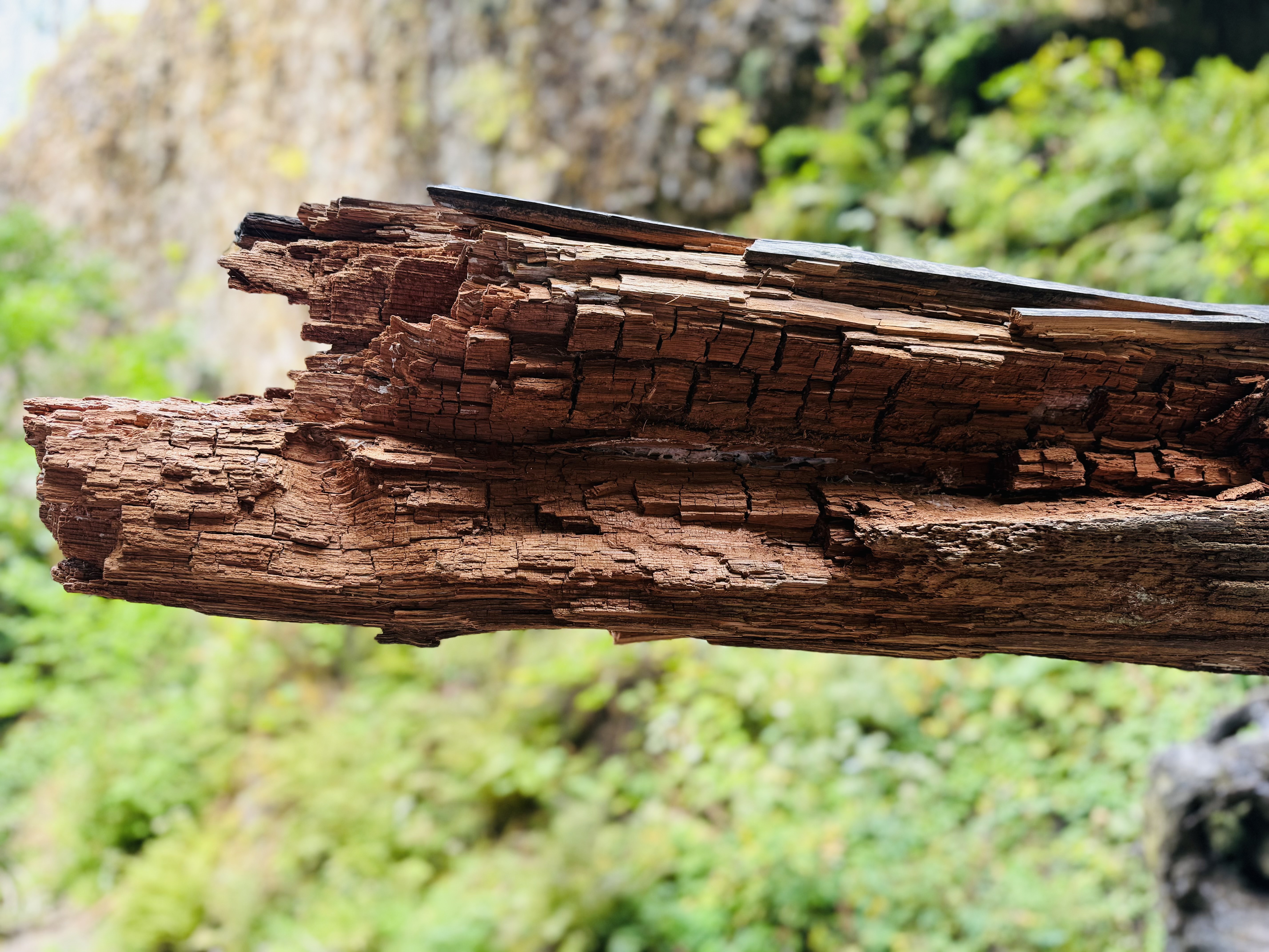 Alternative Text: A close-up of a broken, weathered log, revealing a reddish-brown wood texture. Captured in the Columbia River Gorge National Scenic Area, Oregon, with soft green forest in the background.