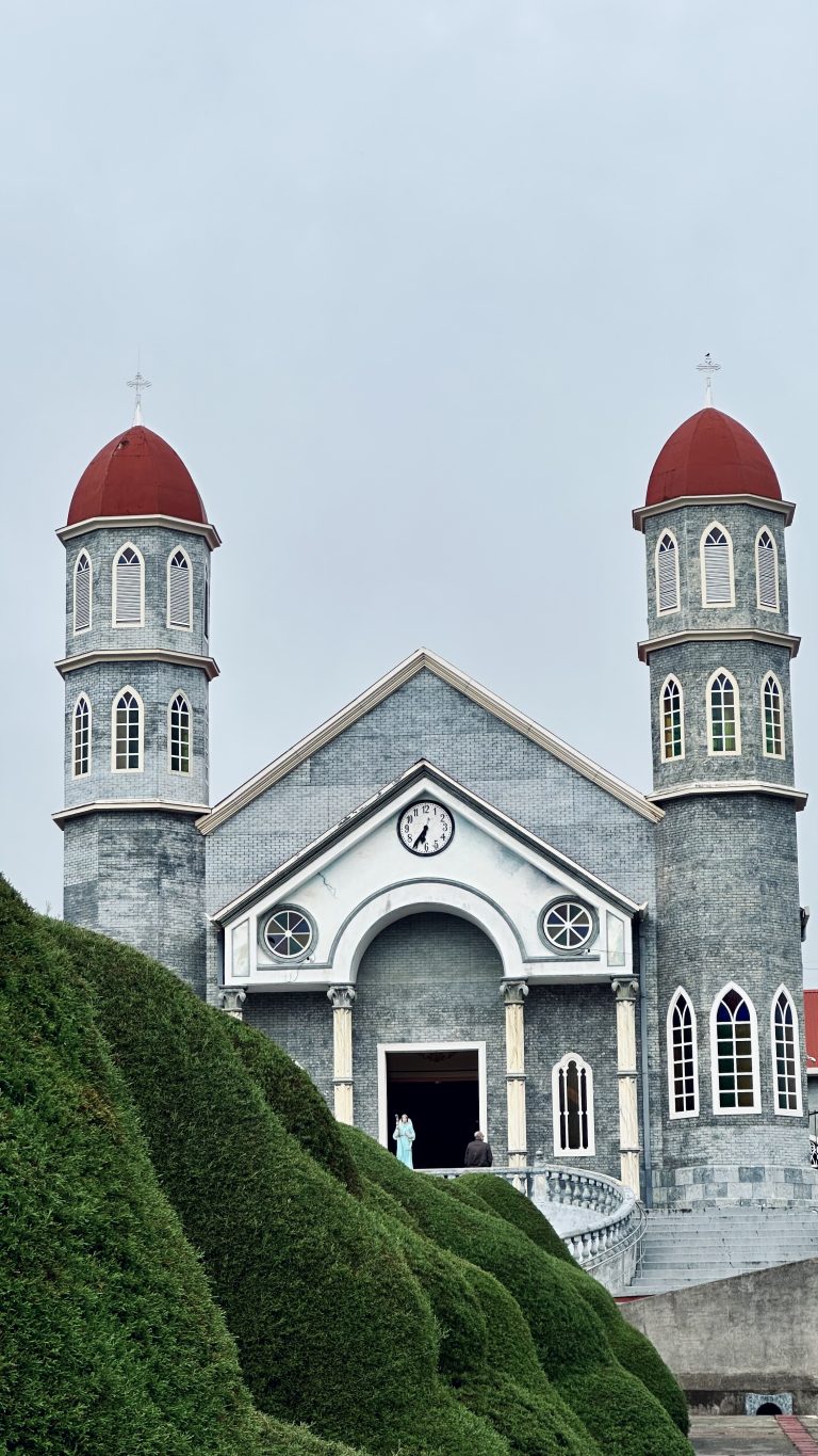 Alternative Text: Front view of Zarcero Church in Costa Rica, with garden shrubs on one side framing the entrance.