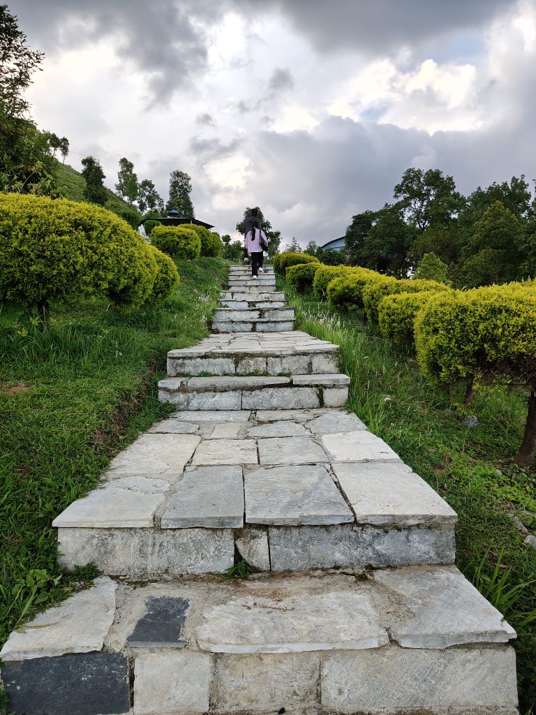 Alternative Text: “Two people walk up a stone staircase surrounded by lush green grass and neatly trimmed bushes.