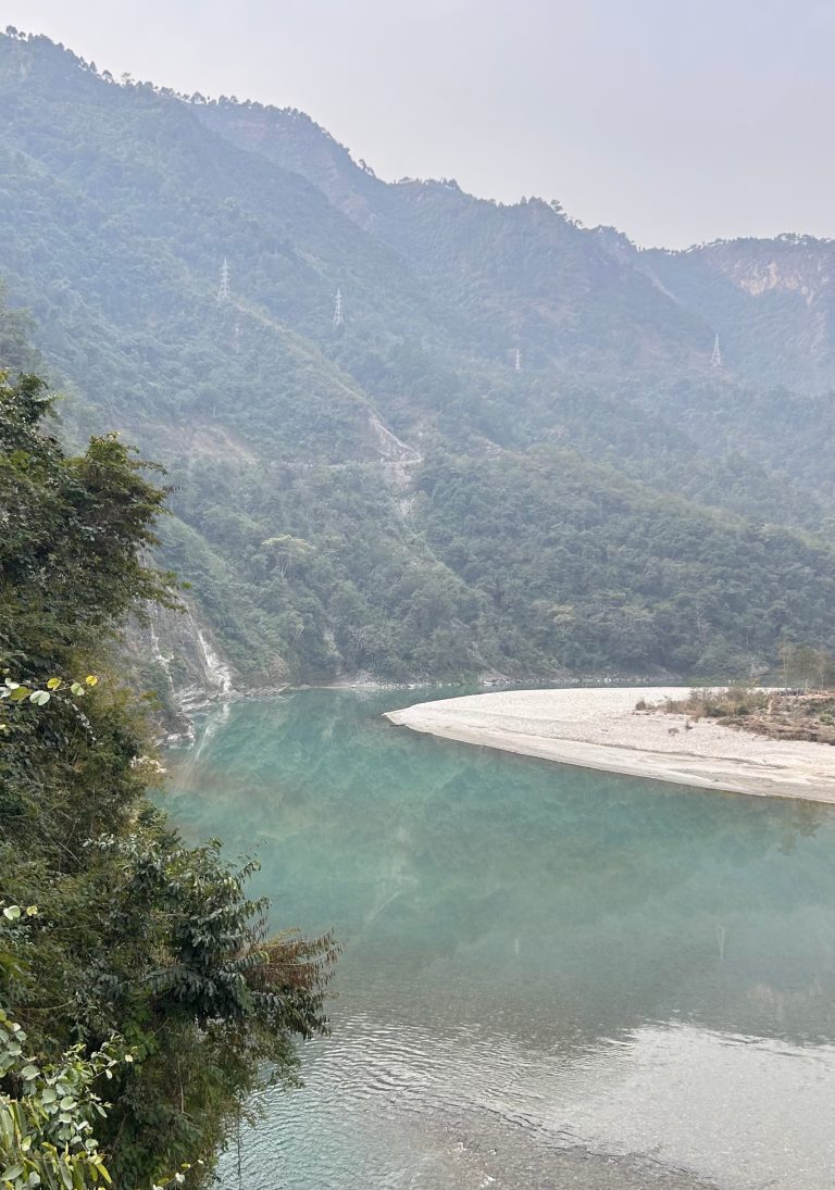 Alternative Text: A tranquil river winds through a lush, green landscape, surrounded by steep mountains covered in dense foliage.