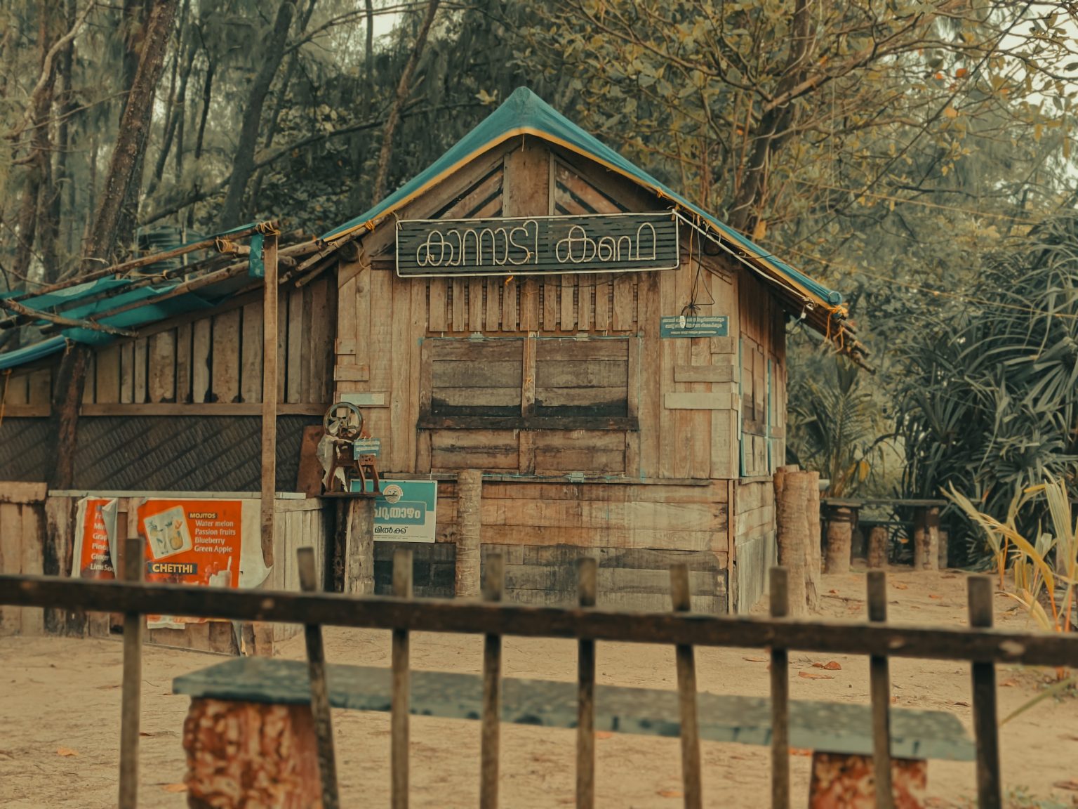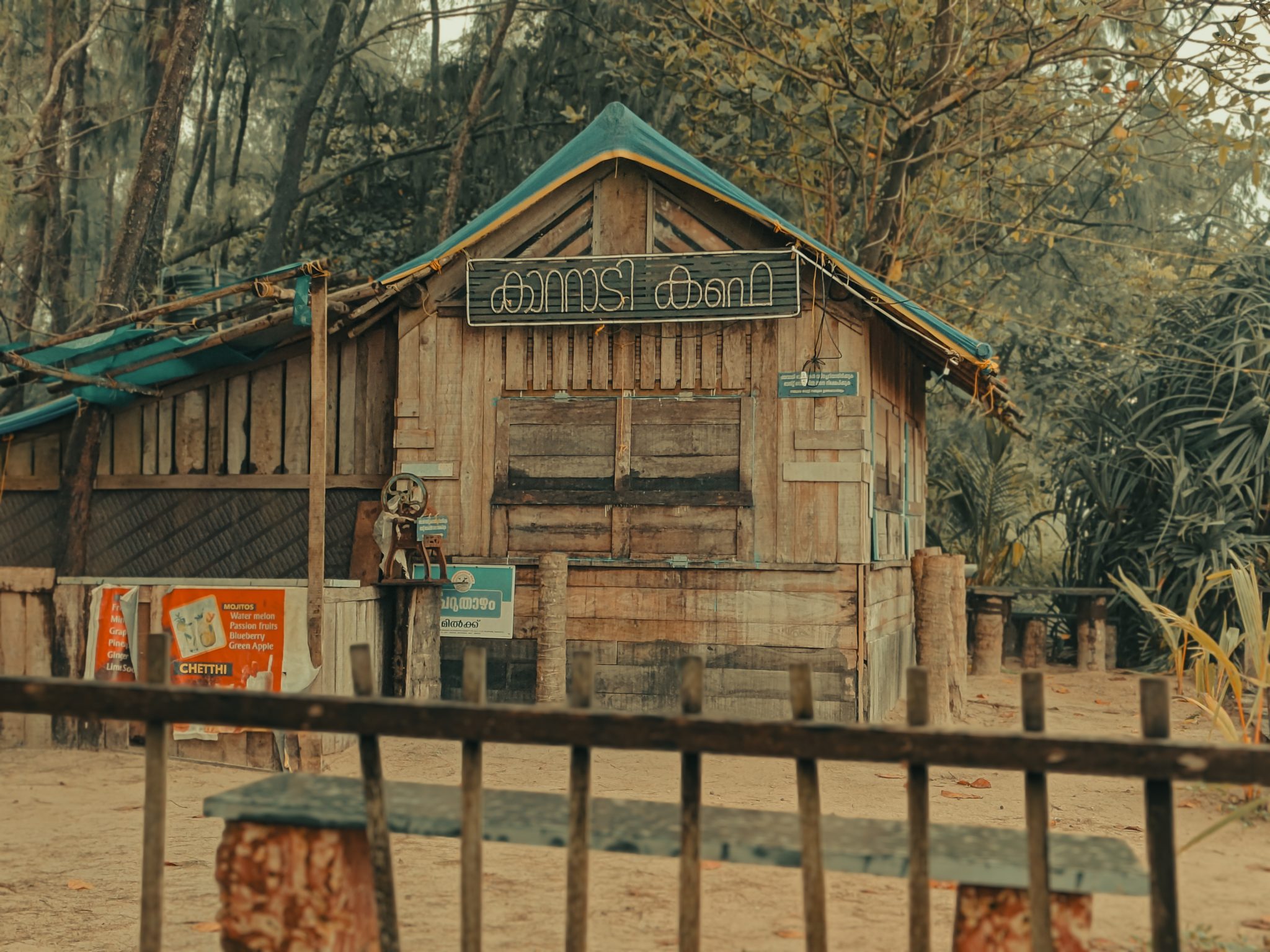 Alternative Text: A rustic wooden hut with a blue tarp roof stands in a dry natural setting, featuring a non-English sign and a wooden fence in the foreground.