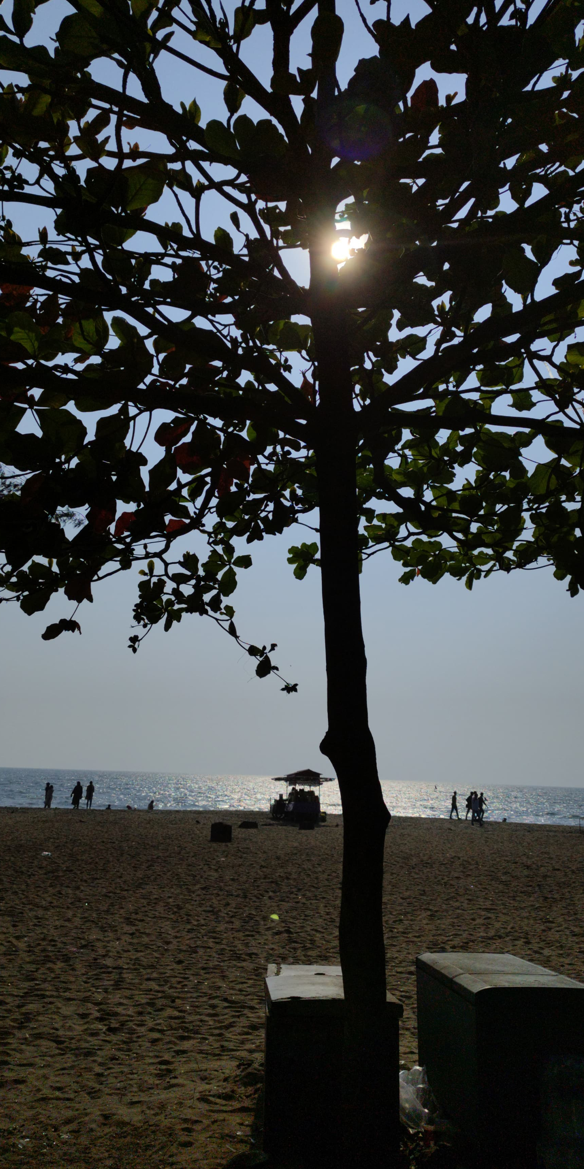 Alternative Text: Silhouettes of people walking on a beach with the water behind them. There is a tree silhouetted in the foreground.