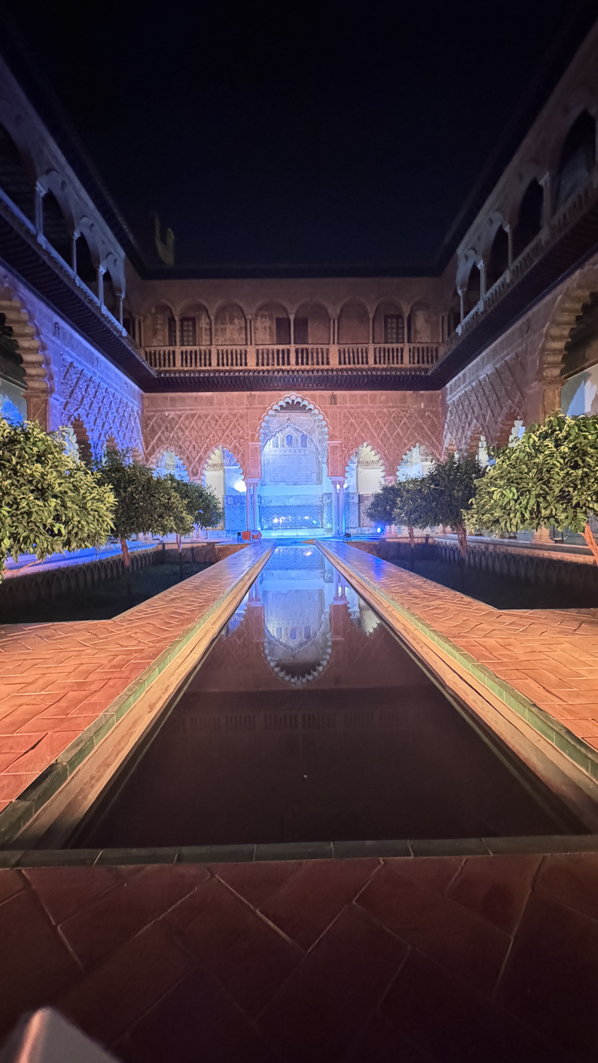 Alternative Text: Alcazar of Seville at night, a courtyard decorated in Moorish style, with brick sidewalks with waterways