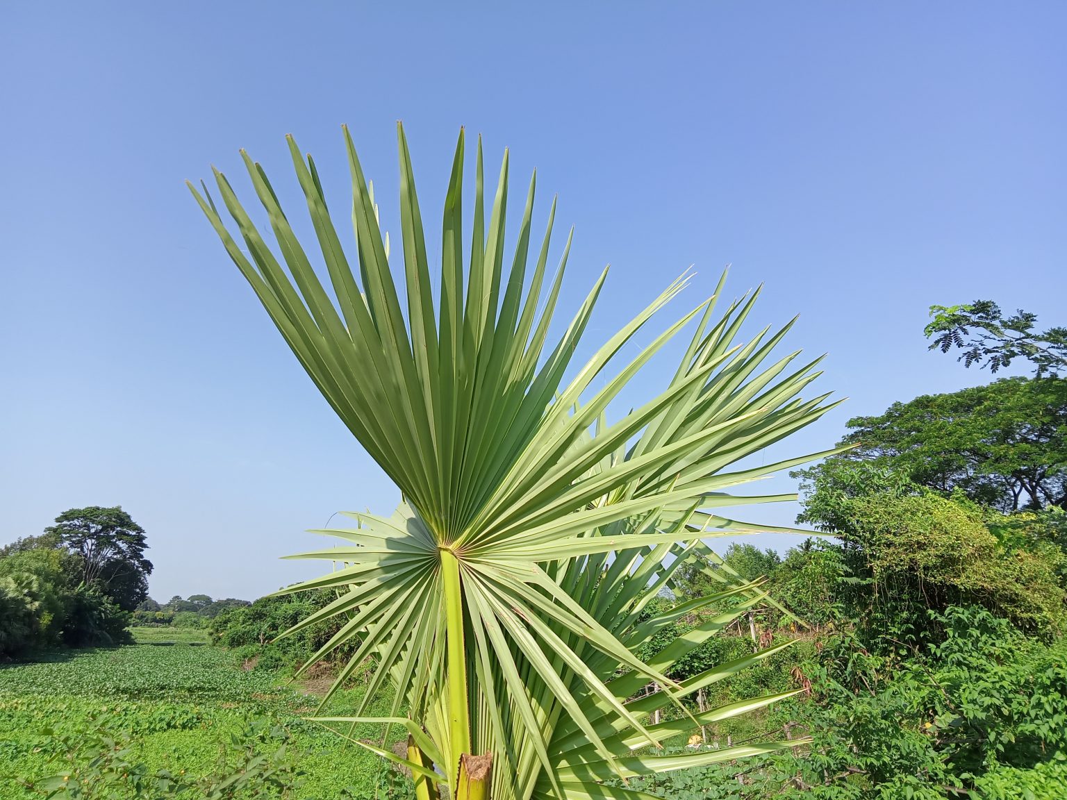 Alternative Text: A close-up view of a large palm leaf against a clear blue sky, with lush greenery and trees in the background, showcasing a tranquil natural environment.