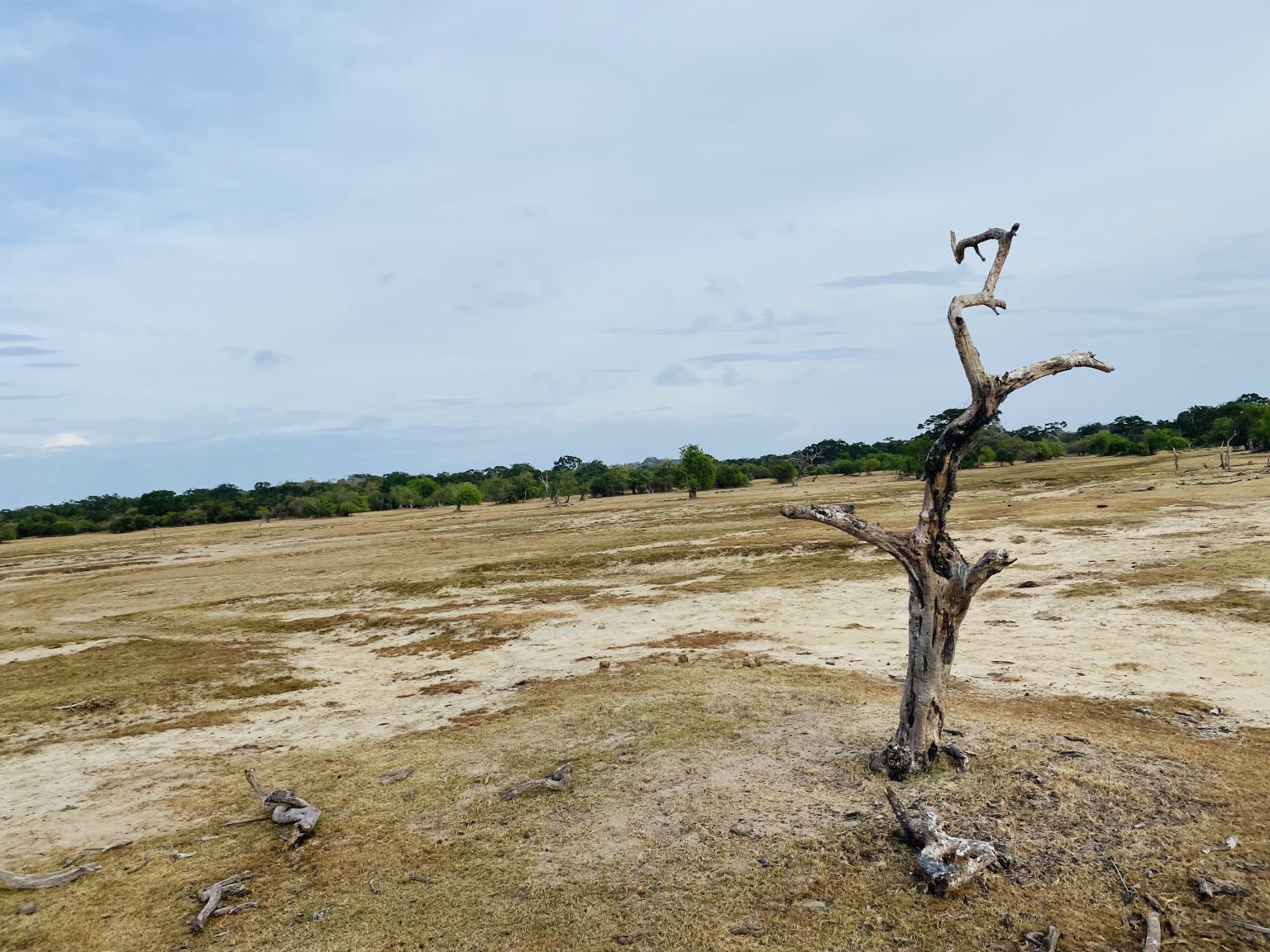 Alternative Text: Dry landscape in Srilanka with a dead tree in front, parched ground, and green forest in the distance.