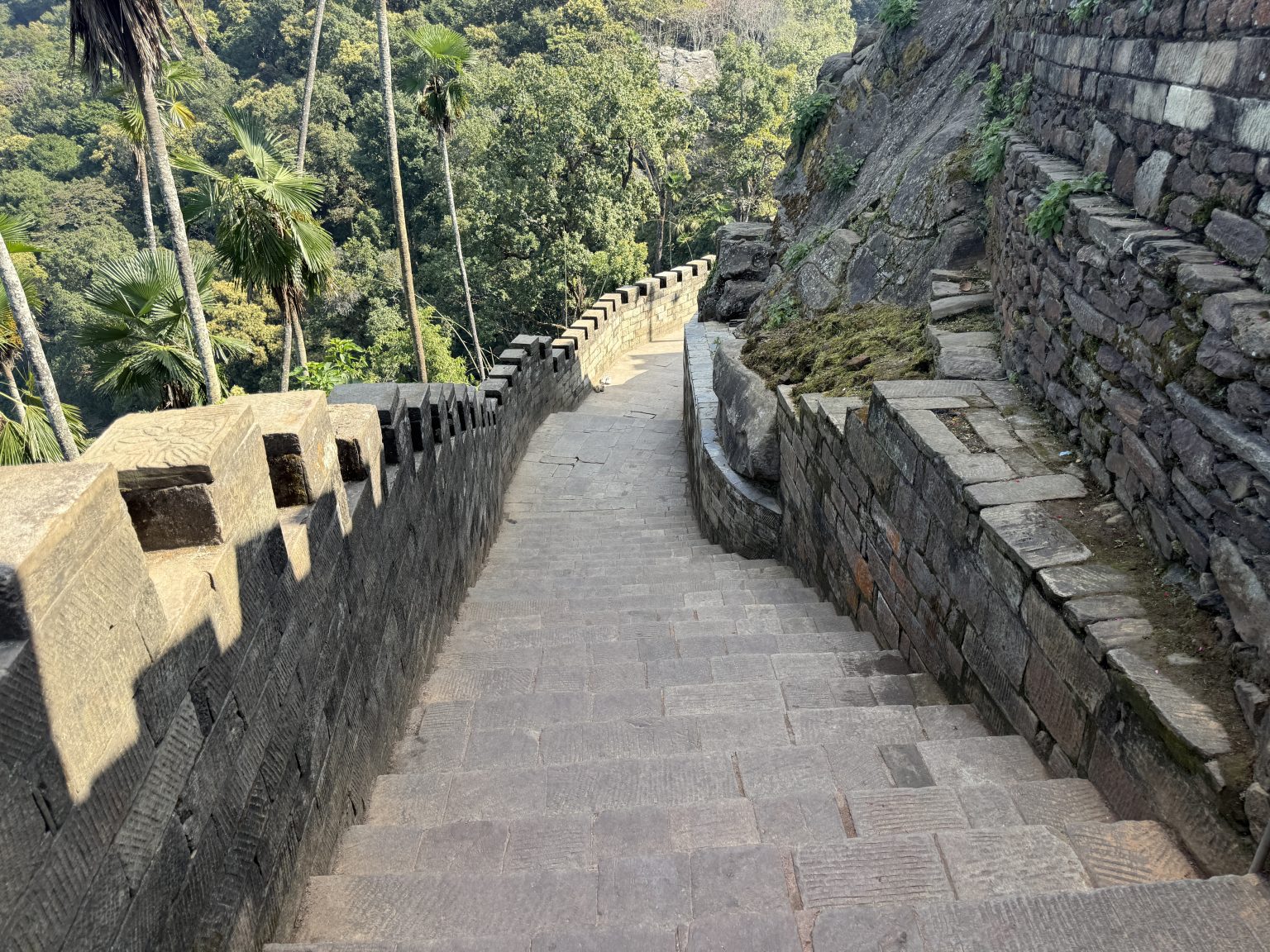 Alternative Text: A stone pathway with stairs leads downwards alongside a stone wall, surrounded by greenery and trees.