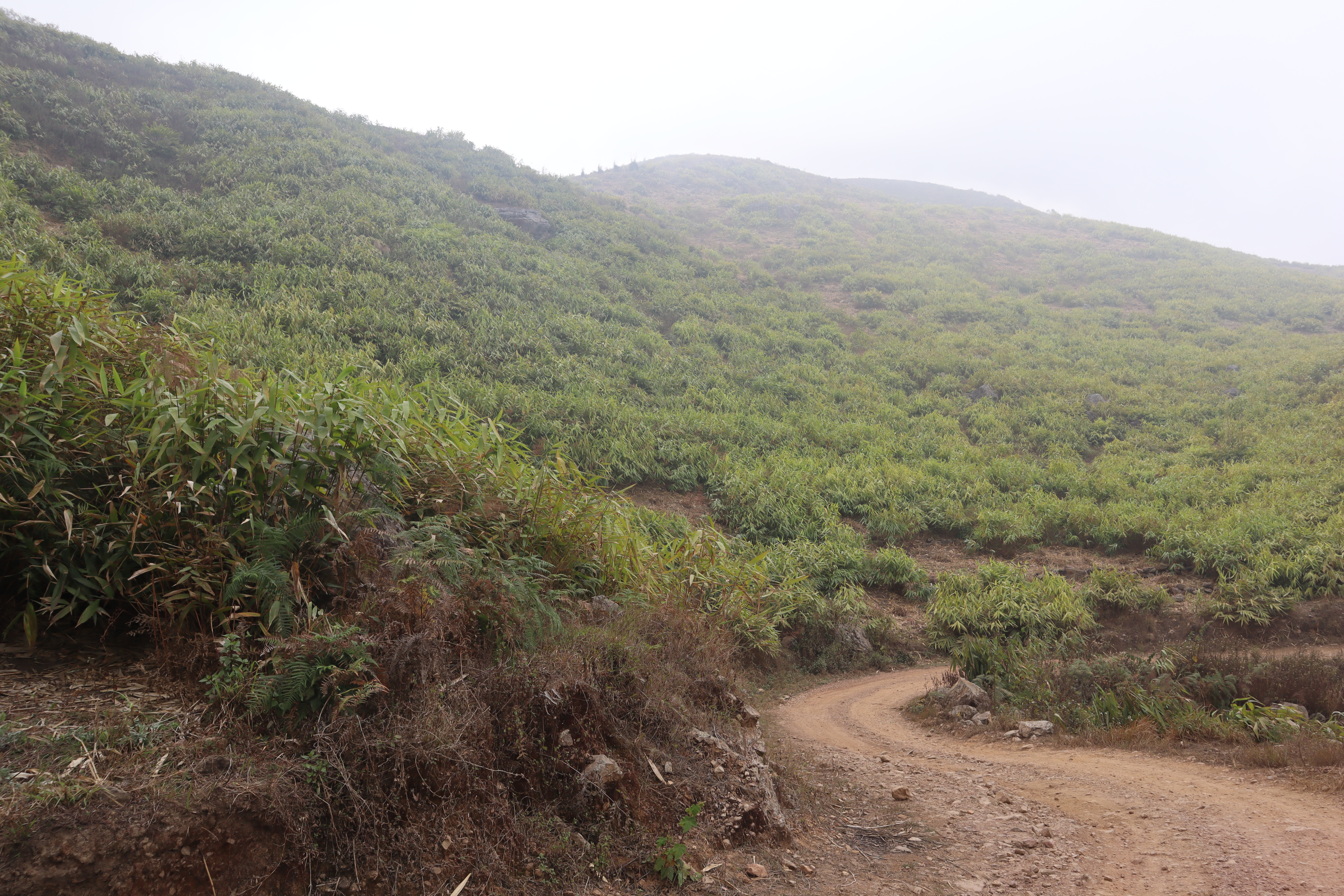 Alternative Text: A winding dirt path leads up a lush green hillside covered with dense foliage. Light mist creates a calm, serene atmosphere, with fog gently obscuring the hill’s peak in the distance.