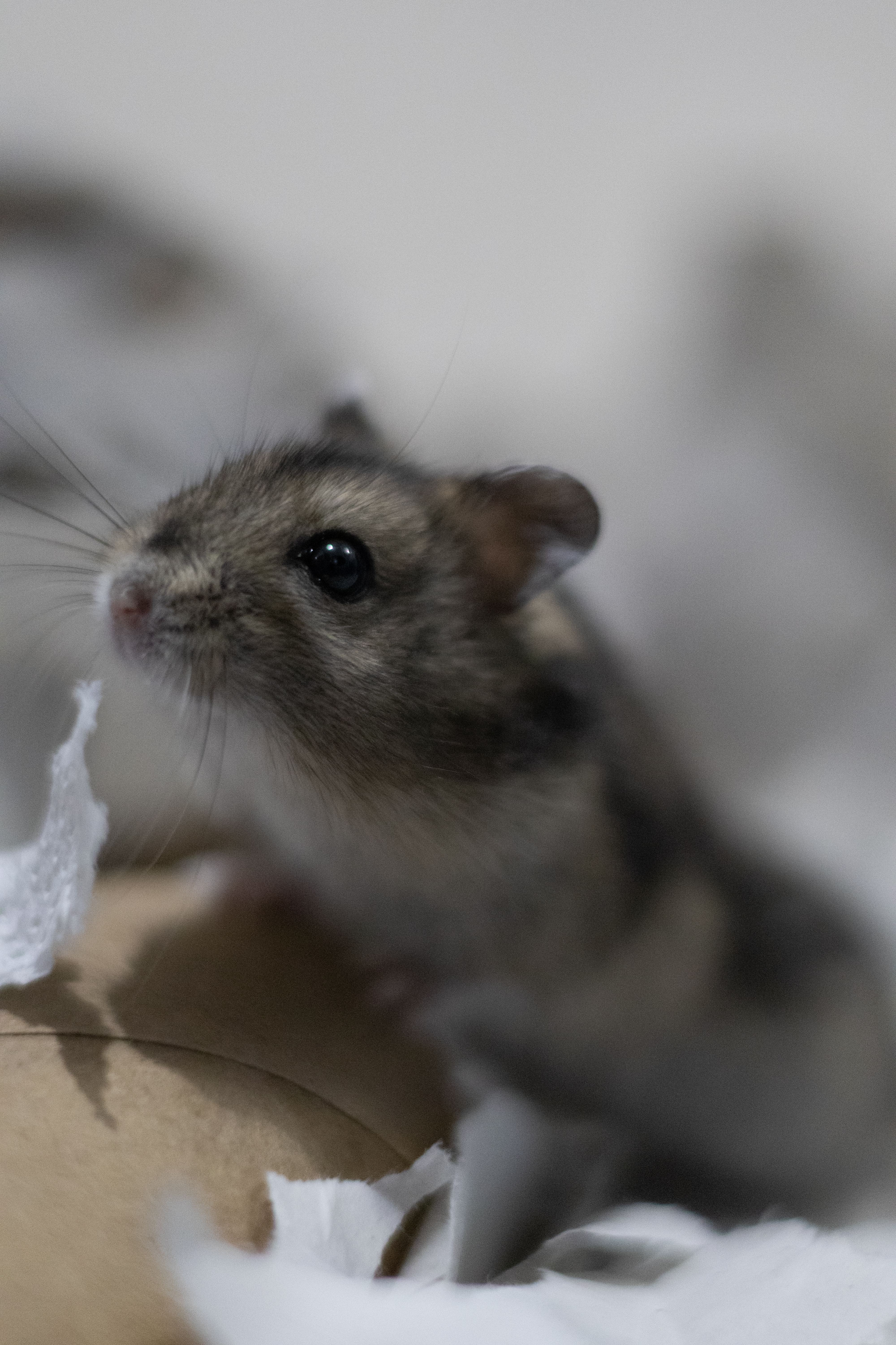 Alternative Text: Close-up of a small hamster with brown and gray fur, looking slightly upward, with soft bedding and bits of torn paper around it against a blurred background.