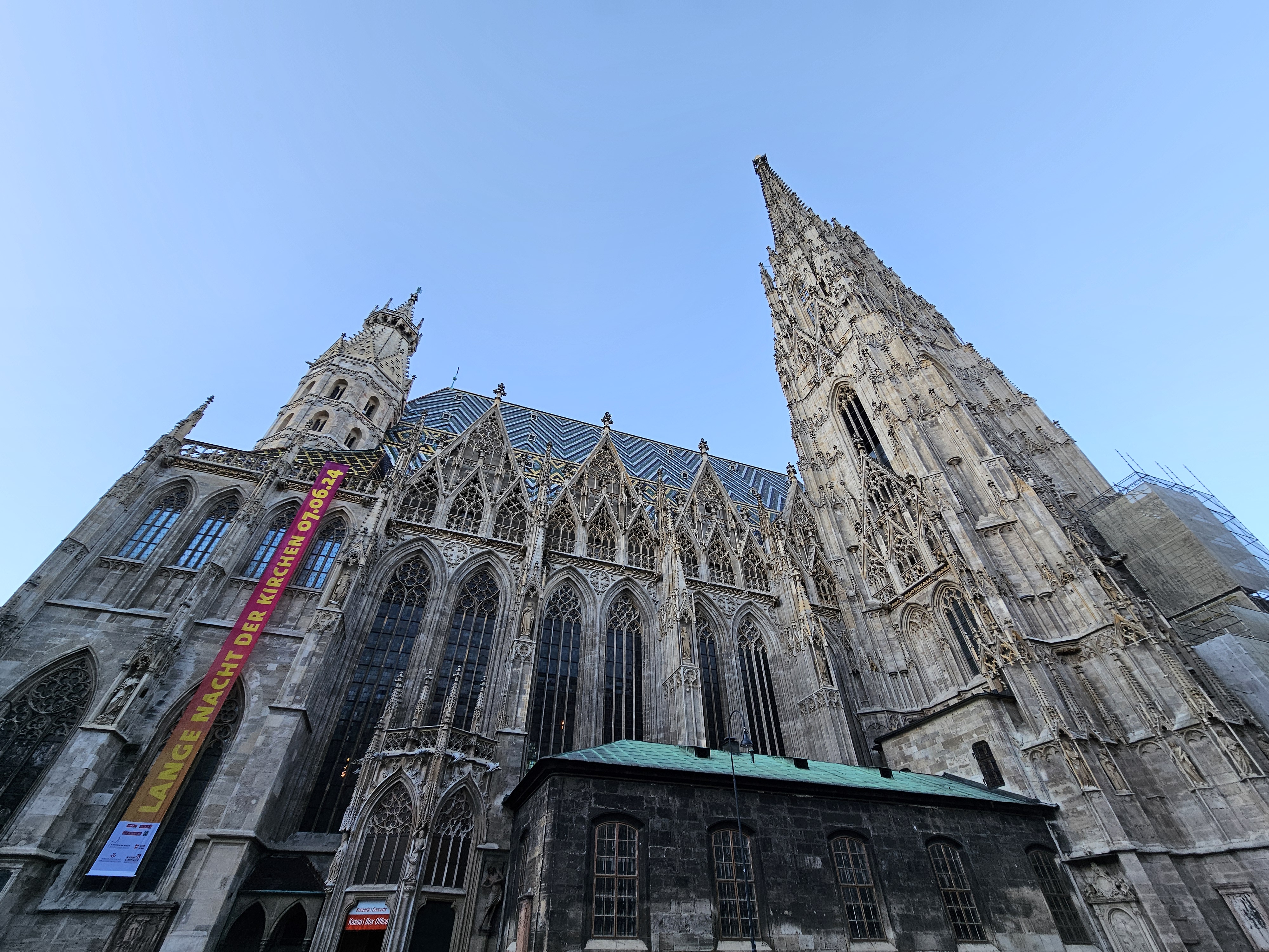 Alternative Text: The St. Stephen’s Cathedral in Vienna, Austria. The cathedral’s intricate Gothic architecture is prominently displayed, showcasing its spires, detailed stonework, and colorful tile roof.