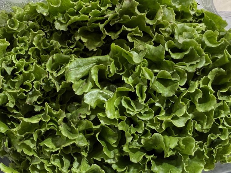 Alternative Text: A close-up shot of fresh, curly green lettuce leaves, showing their natural texture and vibrant color. The wavy leaf edges and moisture details reflect freshness. Captured indoors under soft light in Palazhi, Kozhikode, India.