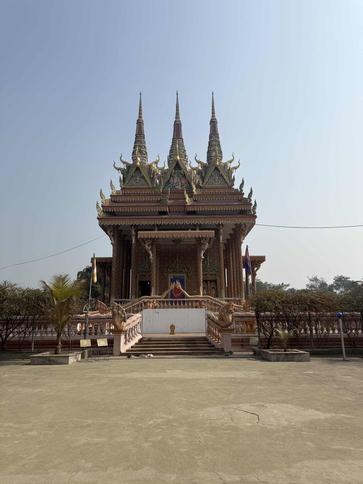 Alternative Text: A beautifully ornate temple stands against a clear blue sky, showcasing intricate architecture with three prominent spires topped by decorative elements.