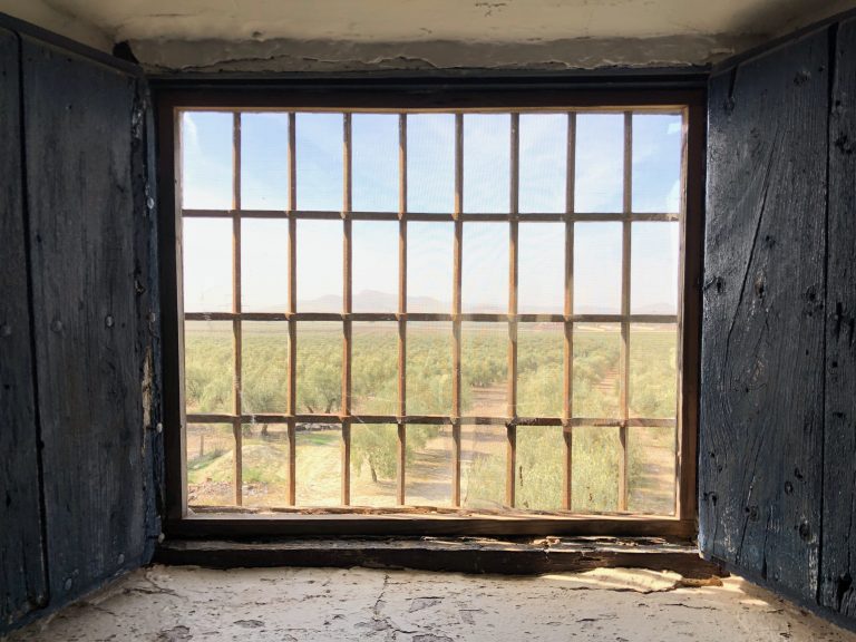 Alternative Text: A rustic window opens to a landscape of olive trees, rolling hills, and a clear blue sky.