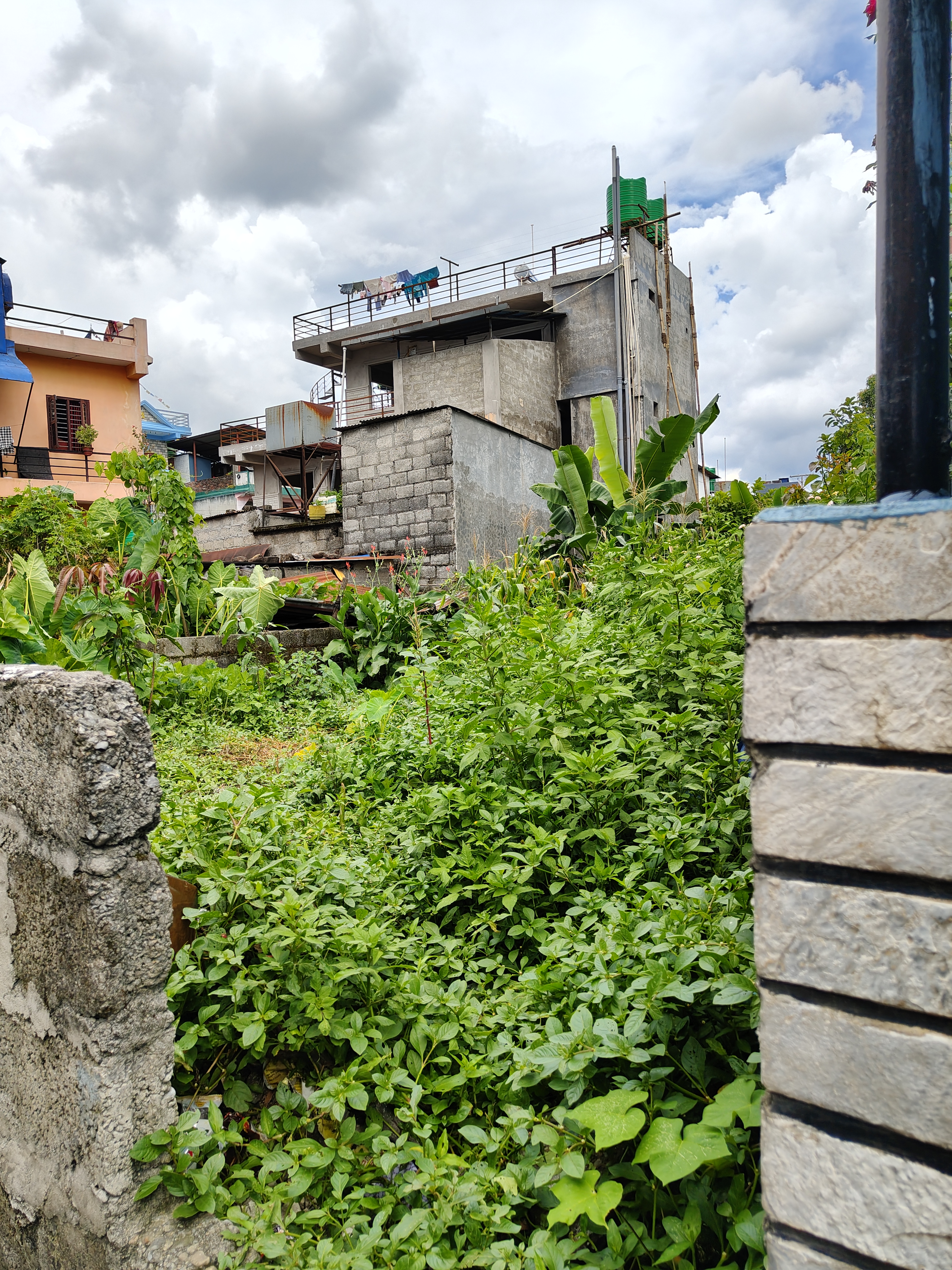 Alternative Text: A view of a cluttered urban landscape featuring various buildings. In the foreground, there is an overgrown area with dense green vegetation.