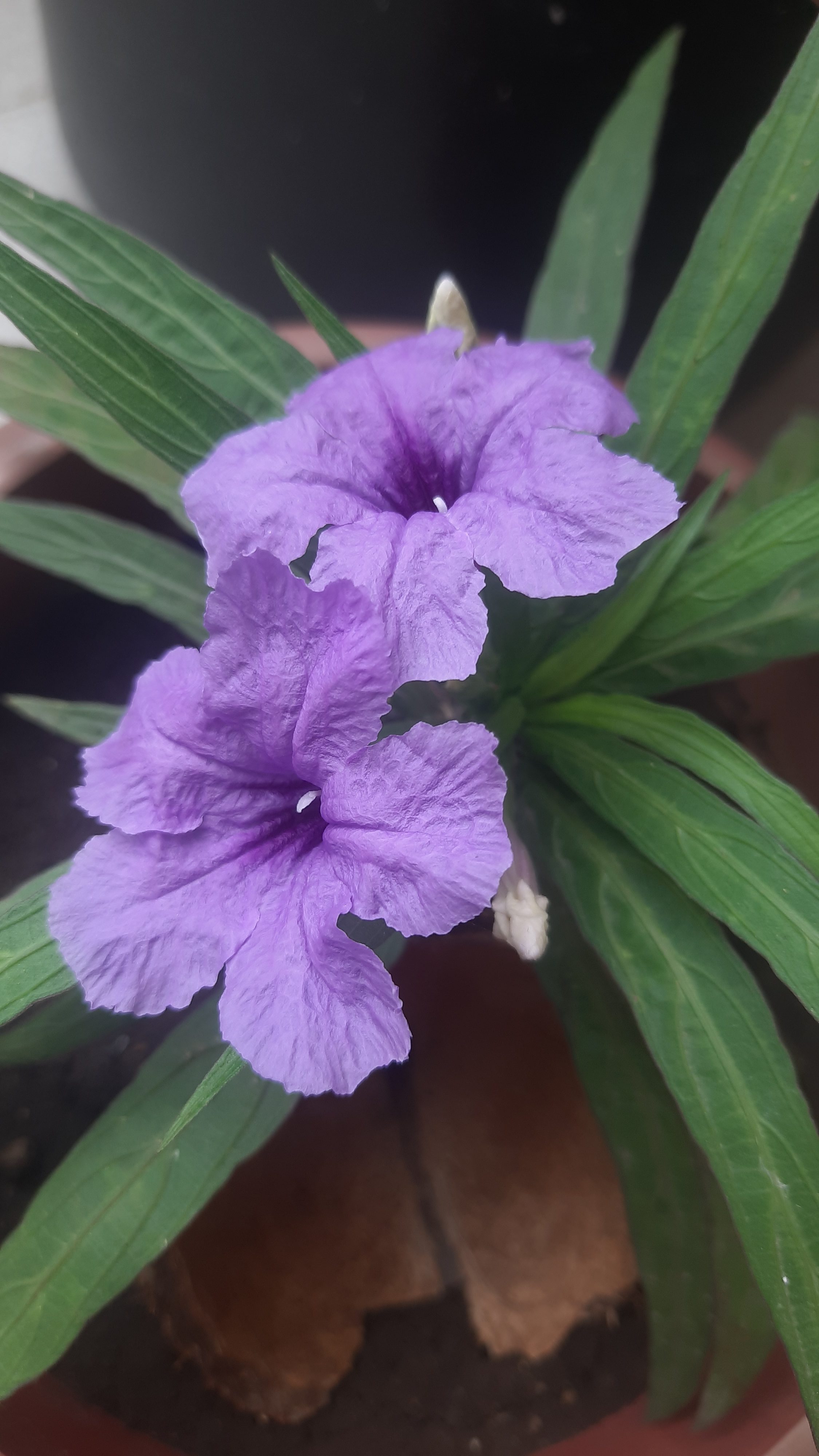 Alternative Text: A close-up of a vibrant purple flower with crinkled petals, surrounded by green leaves.
