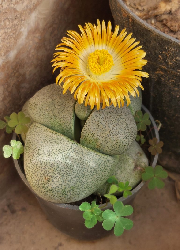 Alternative Text: A Lithops plant, with its distinctive stone-like leaves, produces a vibrant yellow flower. It thrives in a pot with dry, sandy soil, nestled among small four-leafed succulents, showcasing successful care.