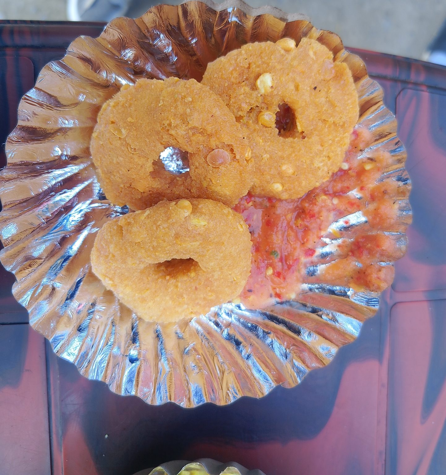Alternative Text: Three golden-brown, round fried Batuk snacks are served on a silver plate.