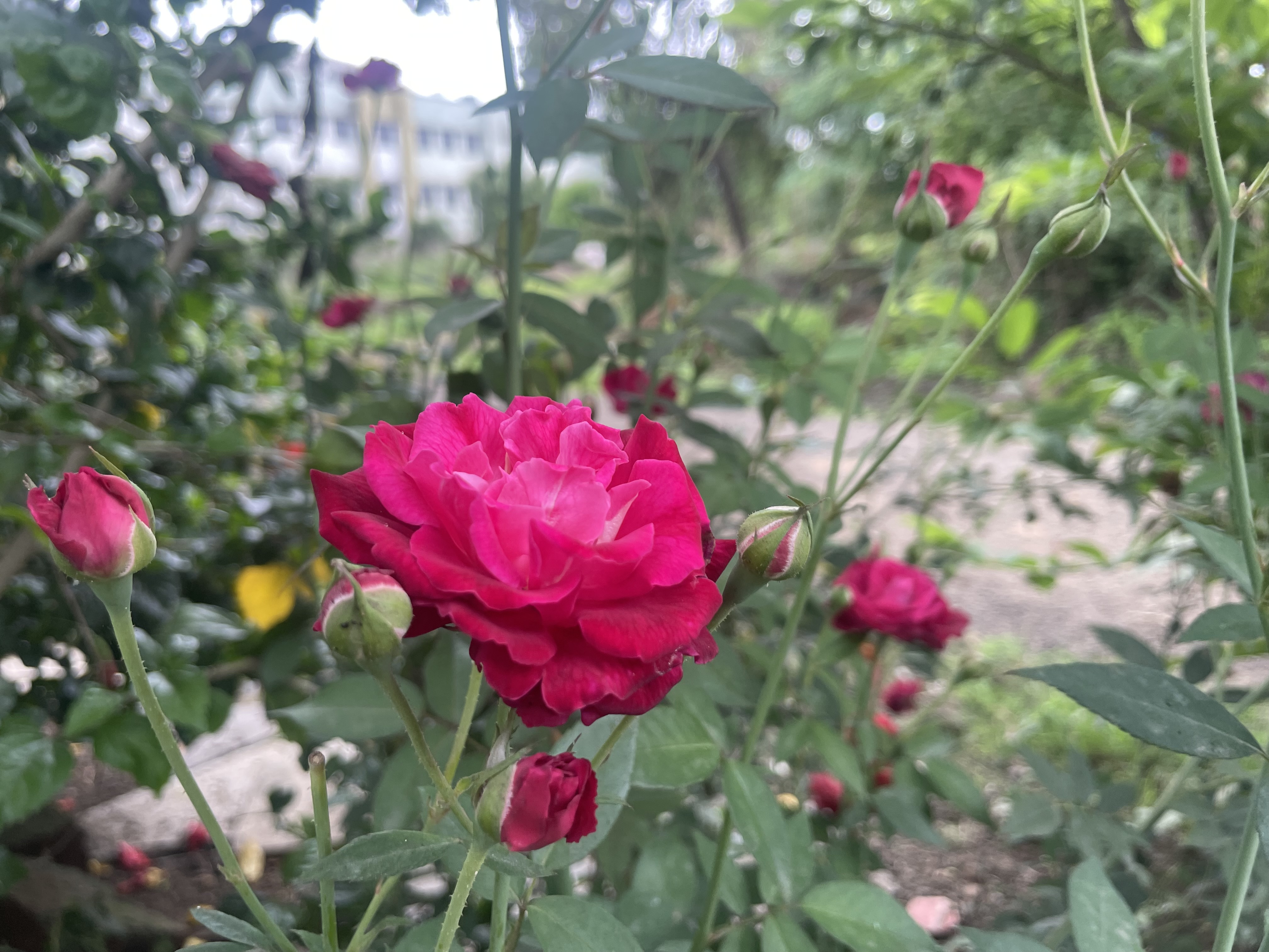 Alternative Text: A vibrant close-up of blooming red roses, showing a range of sizes and stages from fully opened blooms to tight buds.