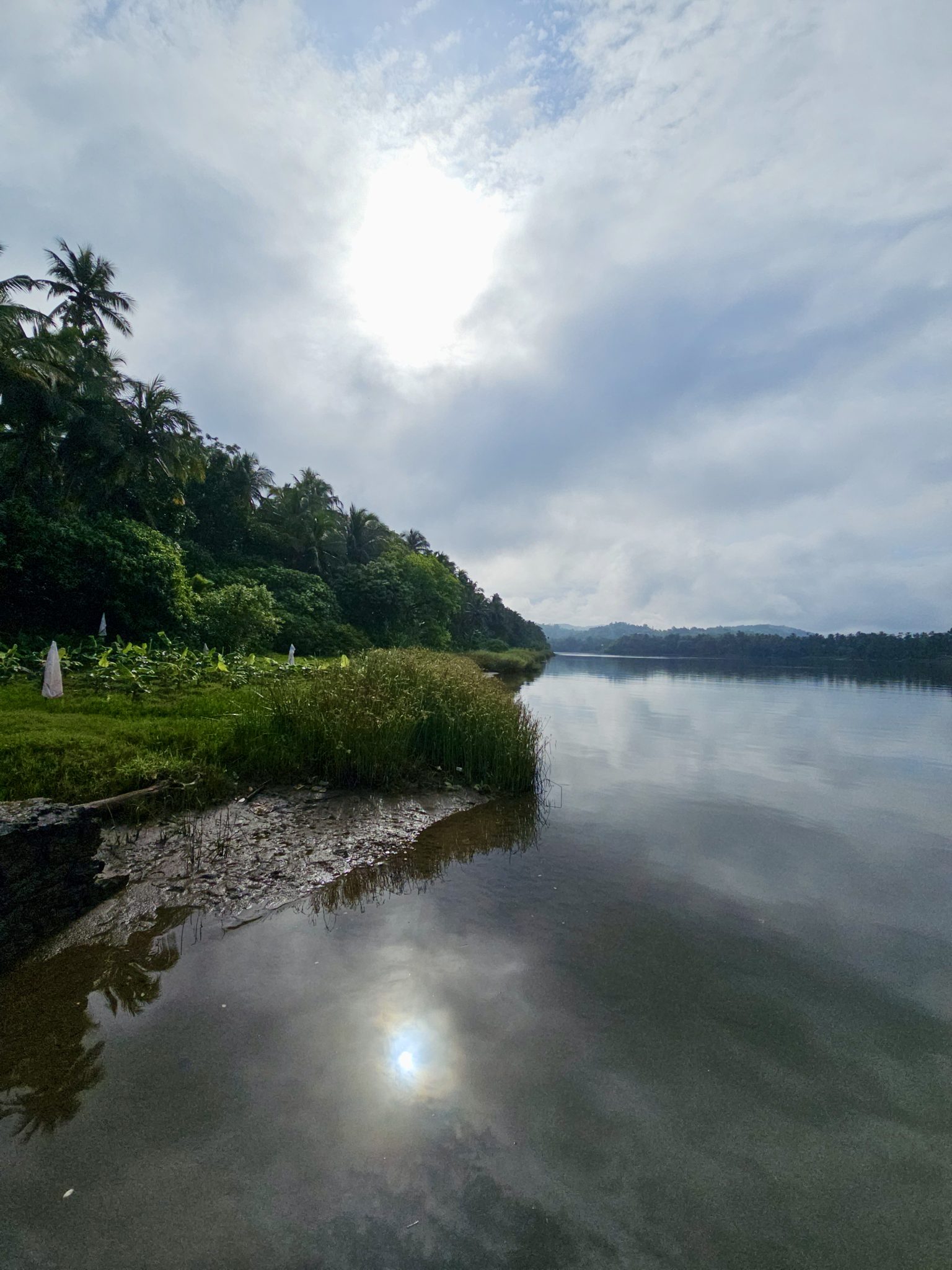 Alternative Text: Soft morning sunlight filters through clouds, reflecting on a river beside green grass and dense trees in Kerala.