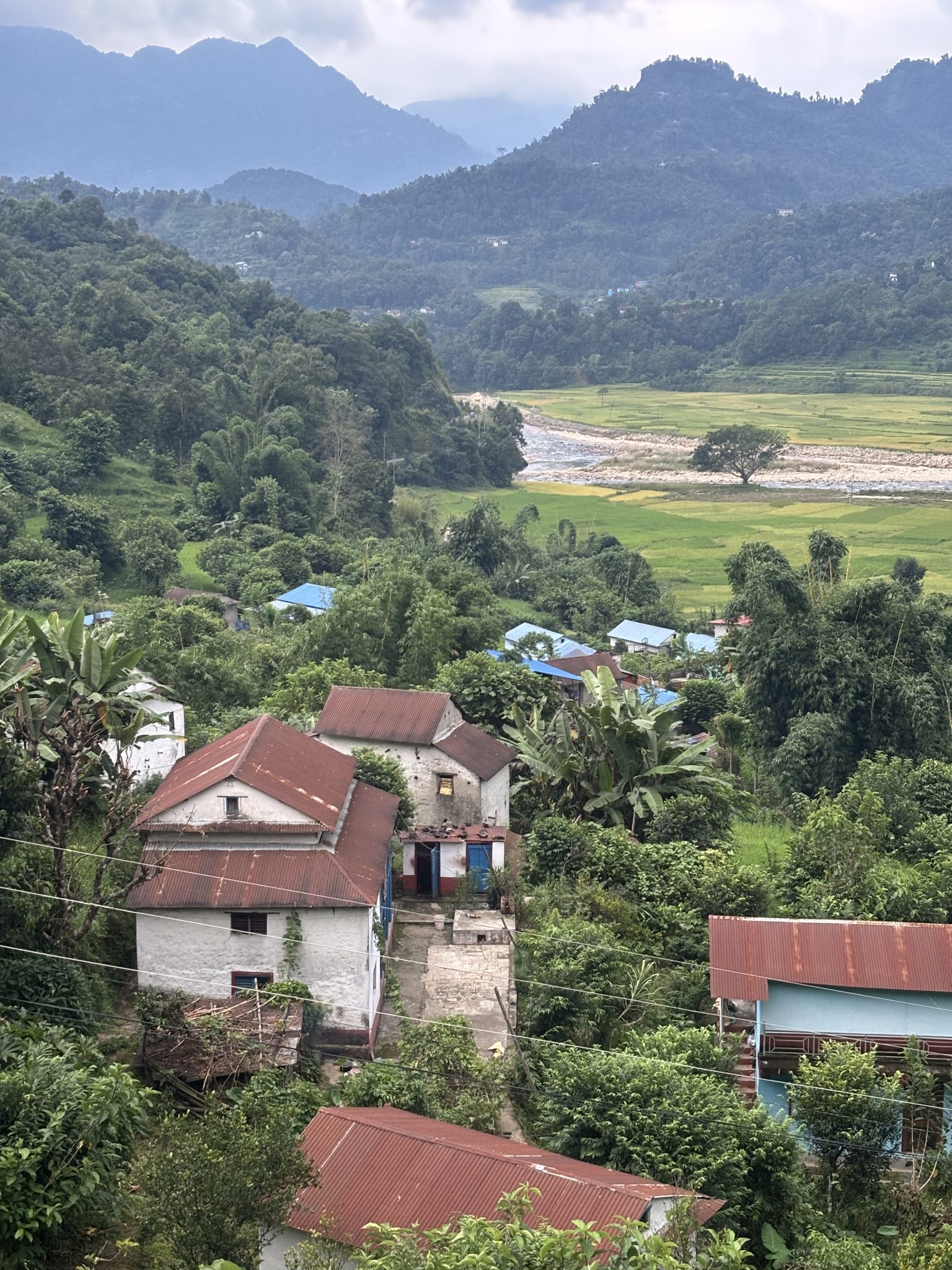 Alternative Text: A scenic view of a rural landscape featuring several houses with brown roofs nestled among lush greenery.