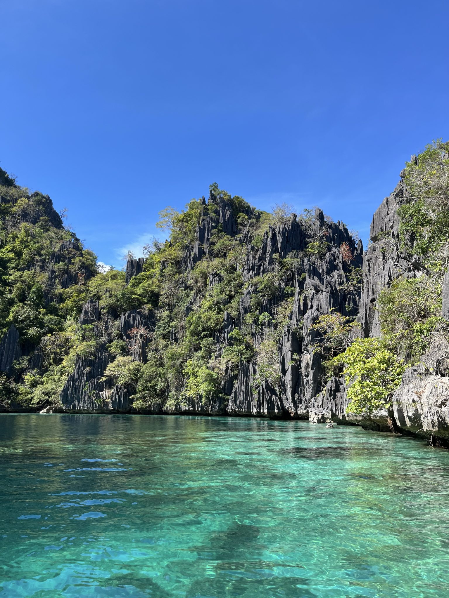 Alternative Text: Clear blue-green water in front of tall dark cliffs covered with green trees, under a bright, cloudless blue sky.