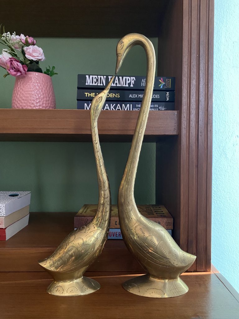 Alternative Text: A pair of decorative brass crane sculptures are displayed on a wooden shelf.
