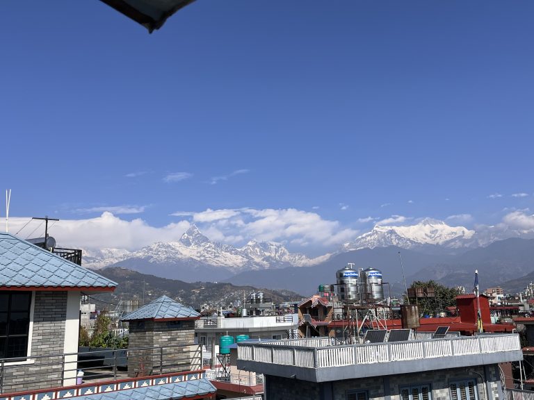 Alternative Text: A wide view of snow-covered mountains under a blue sky. In front, there are buildings with different rooftops, some blue, along with water tanks and solar panels, showing a mix of city life and mountain scenery.