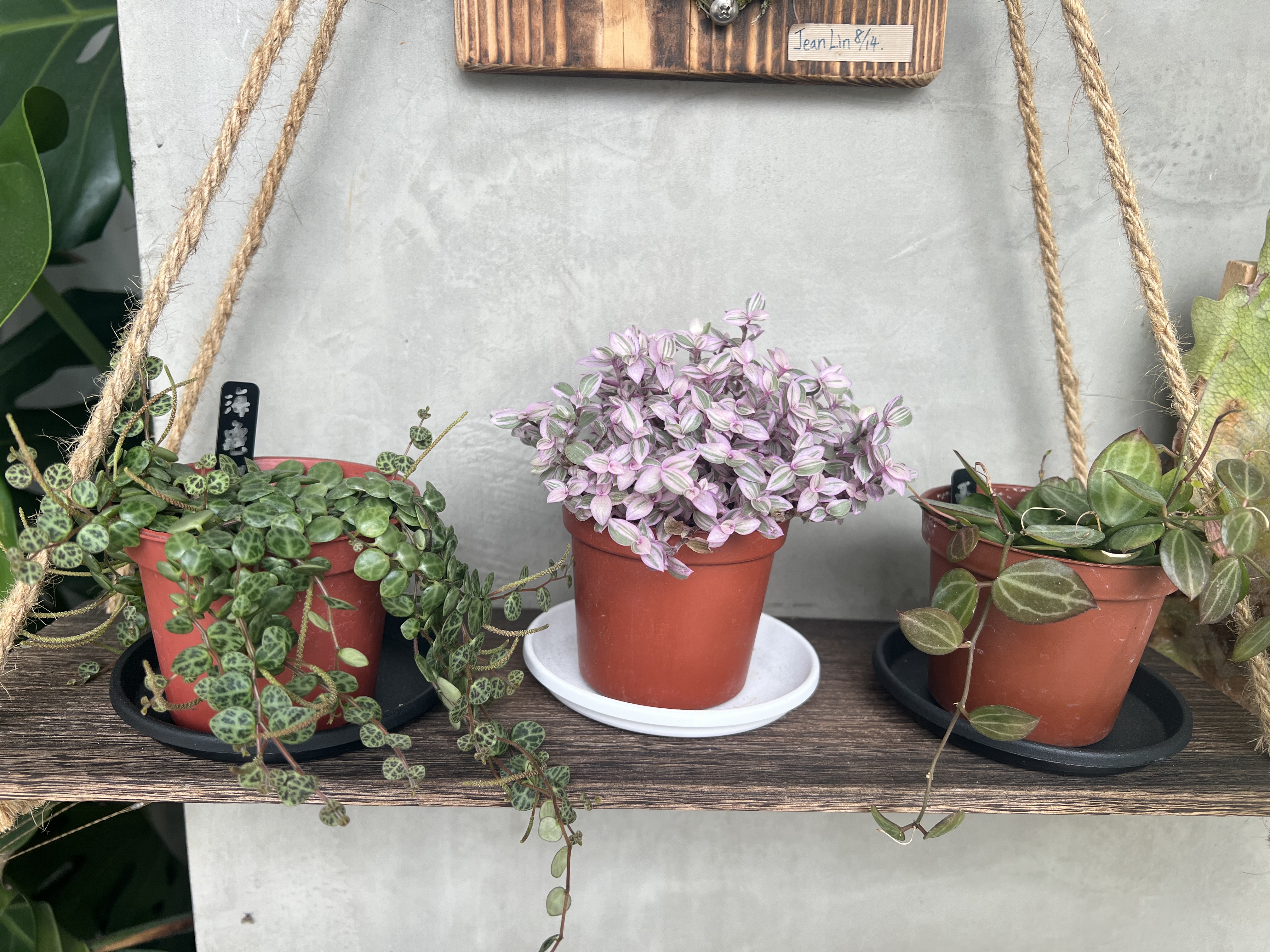 Alternative Text: Three potted plants sit on a rustic wooden shelf, which is hanging by ropes against a gray wall.