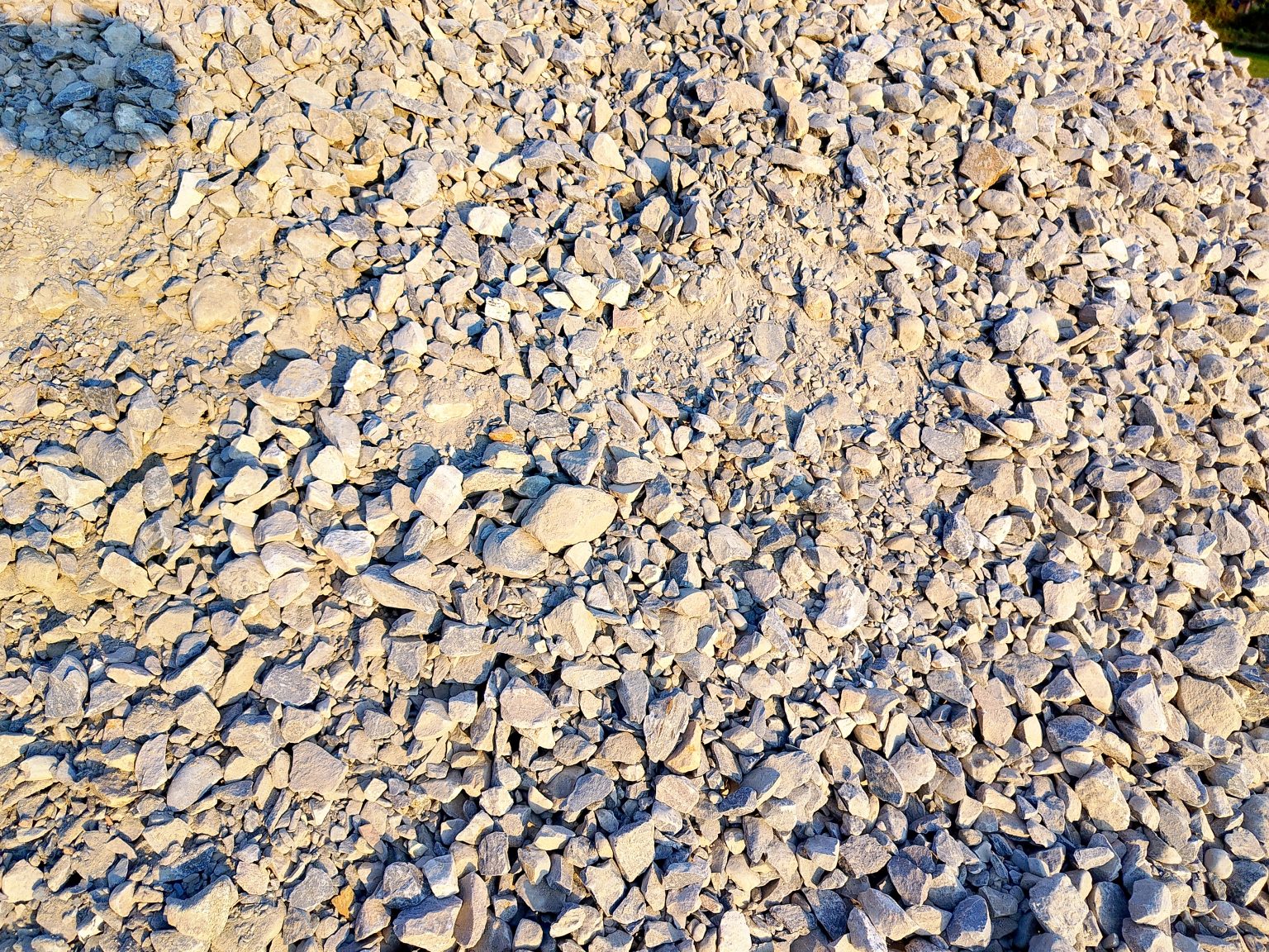 Alternative Text: A close-up view of a pile of small, irregularly shaped gray rocks and pebbles scattered across a sandy surface, with varying textures and sizes, illuminated by sunlight.