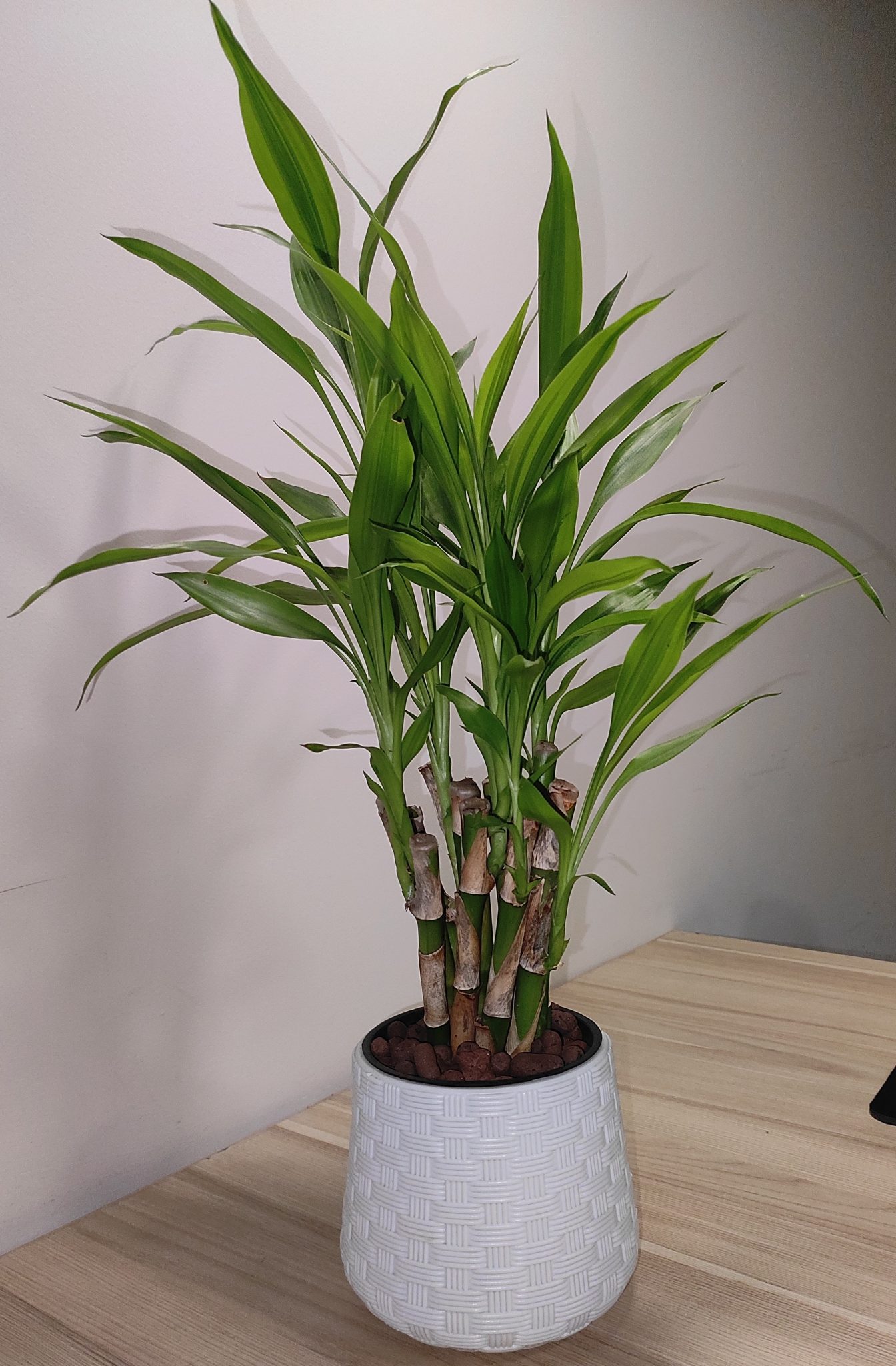 Alternative Text: Lucky bamboo in a decorative textured white pot, placed on a wooden surface against a white wall.