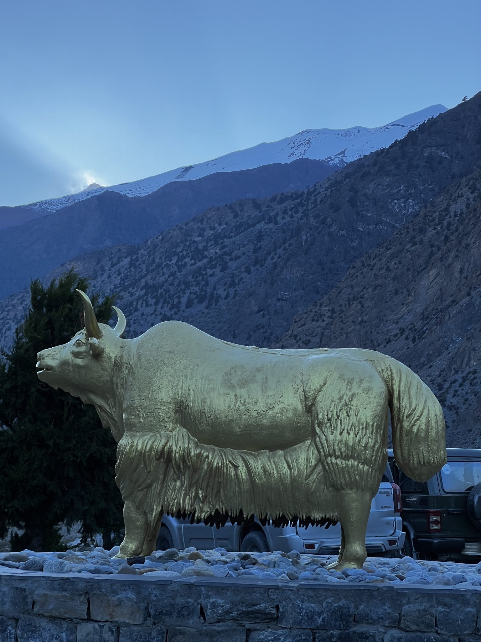 Alternative Text: A golden yak statue set against snowy mountain cliffs under a cloudy blue sky.