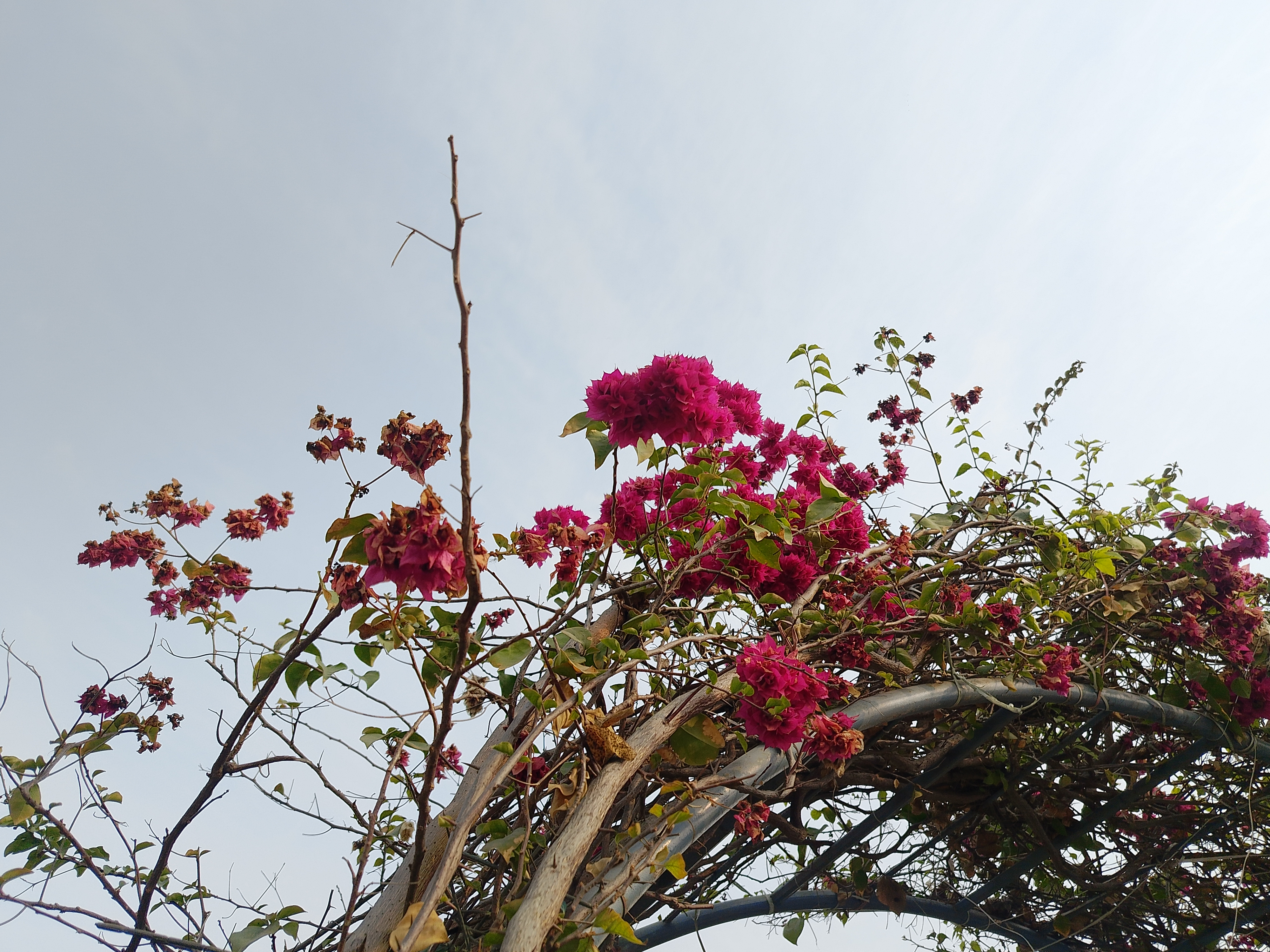 Alternative Text: A close-up view of vibrant pink flowers intertwined with green leaves and bare branches, under a light gray sky.