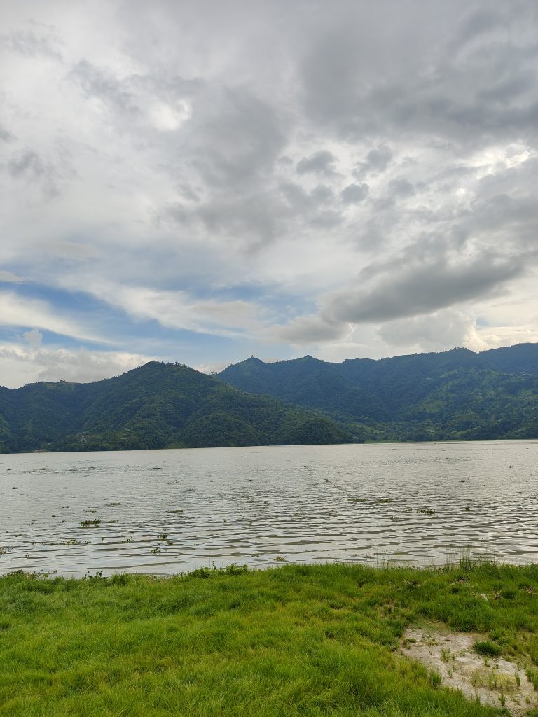 Alternative Text: A serene landscape featuring a calm lake surrounded by lush green hills and mountains under a cloudy sky.