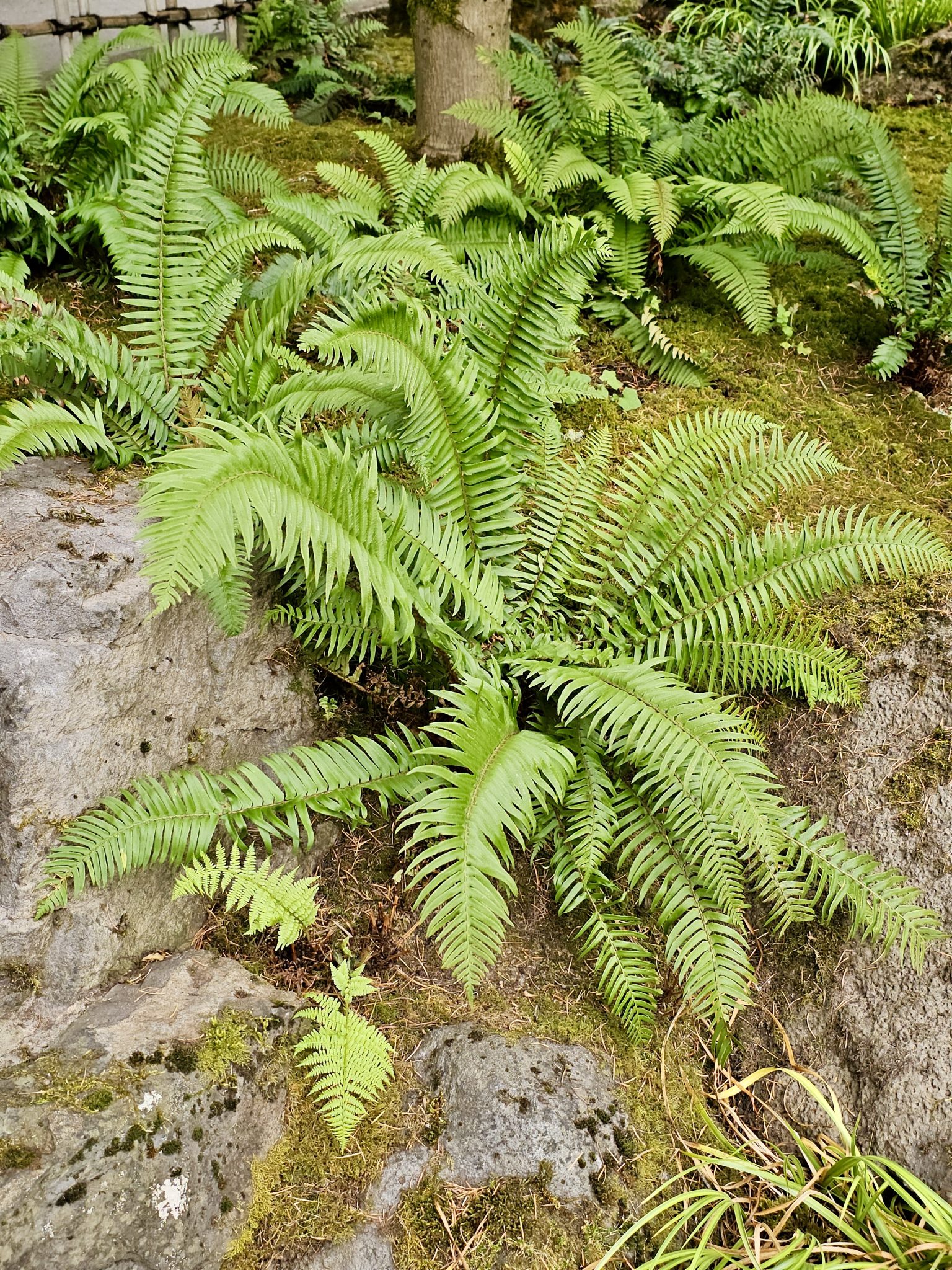 Alternative Text: Close-up view of lush green ferns growing on a mossy rock bed at the Portland Japanese Garden. The textures and natural patterns of the leaves are clearly visible.