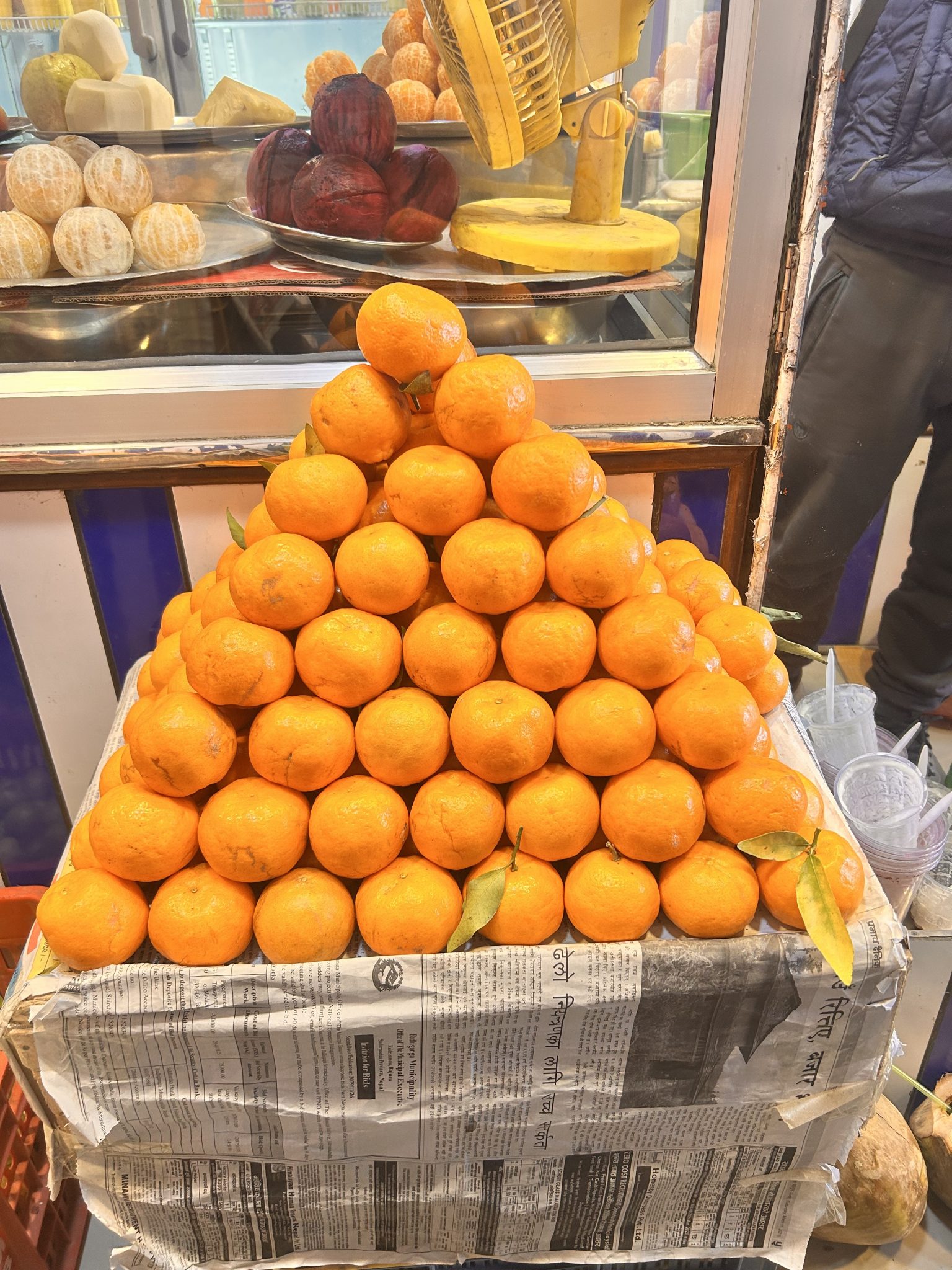 Alternative Text: A pyramid stack of fresh oranges displayed on a newspaper-covered box. In the background, there are peeled and whole fruits, along with a machine, possibly a fruit juicer. A person is partially visible wearing a dark-colored outfit.