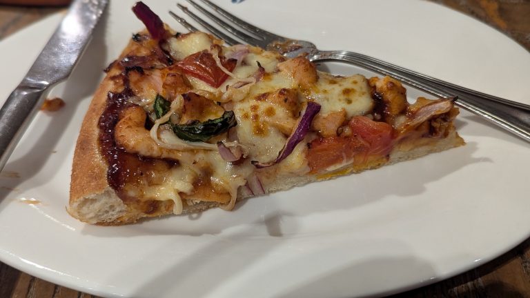 Alternative Text: A slice of pizza placed on a white plate, topped with melted cheese, diced chicken, red onions, and various vegetables.
