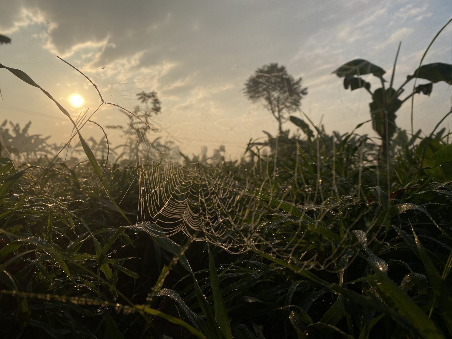 Alternative Text: A close-up view of a spider web glistening with dew in the foreground, set against a backdrop of tall grass and silhouetted plants.