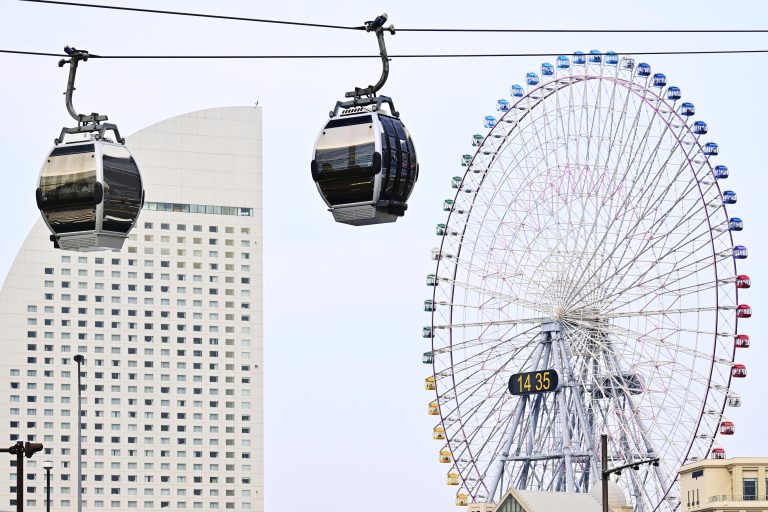Alternative Text: Two cable cars pass by a colorful Ferris wheel and a curved building in Yokohama, Japan, under a clear sky.